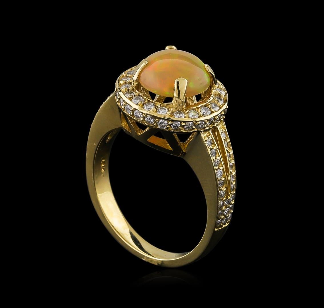 One electronically tested 14KT yellow gold lady's cast fashion ring with a split shank halo with a bright polish finish. The featured lady's ring has a shank measuring 2.72 millimeters wide. Identified with markings of "14K". Condition is new, good workmanship. Containing: One semi crystal opal that is cut in a round shaped cabochon and is prong set, measuring 8.97 mm long x 8.89 mm wide, and 3.99 mm thick and the approximate weight is 1.48 carats. The opal has a somewhat bright, orange-green play of color (fire) in a rolling flashfire pattern; a medium dome; a good cut; no inclusions; minor dull spot in its brightness and pattern; and is not directional. Graded in the setting. Twenty-Four prong set round brilliant cut diamonds, measuring 1.50 - 1.40 x 0.90mm (depth est.) approximate total weight of 24 Stones = 0.28ct. Graded in the setting. Clarity: SI-1 to I-1. Color: G - Good Sixty-Two prong set round brilliant cut diamonds, measuring 1.35 - 1.20 x 0.79mm (depth est.) approximate total weight of 62 Stones = 0.48ct. Graded in the setting. Clarity: SI-2 to I-1. Color: G - I. Cut Good. Total Weight of Diamonds 0.76ct. Total Weight of Opals 1.48ct. Total Weight of Ring 7.30gm. GAS Appraised.
