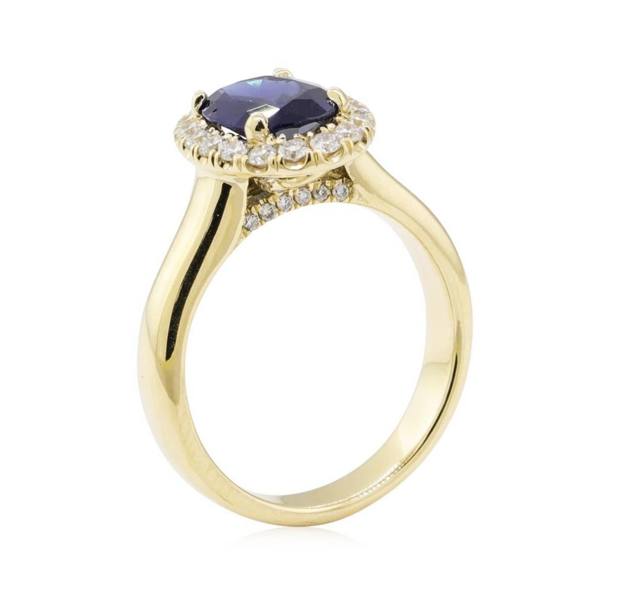 One electronically tested 14KT yellow gold lady's cast fashion ring with a half dome shank with a halo with a bright polish finish. The featured lady's ring has a shank measuring 3.15 millimeters wide. Identified with markings of '14K'. Condition is new, good workmanship. Containing: One prong set oval modified mixed cut natural blue sapphire, measuring 8.70 x 6.47 x 2.20mm, (depth est.) approximate weight of 1.03ct., clarity is moderately included, medium dark, moderately strong, blue color, (GIA B 6/4), cut is good. Transmitting light somewhat diffusely, transparent to translucent. Colored gemstones are presumed to have been subjected to commonly used enhancement processes. Graded in the setting. Eighteen prong set round brilliant cut diamonds, measuring 1.80 - 1.75 x 1.10mm (depth est.) approximate total weight of 18 Stones = 0.40ct. Graded in the setting. Color G - H Clarity VS-1 to VS-2 Cut Very Good Twelve prong set round brilliant cut diamonds, measuring 1.00 - 1.00 x 0.62mm (depth est.) approximate total weight of 12 Stones = 0.05ct. Graded in the setting. Color G - H Clarity VS-2 to SI-1 Cut Very Good. Total Weight of Colored Stones 1.03ct.. Total Weight of Diamonds 0.45ct.. Total Weight of Ring 5.10gm GAS Appraised at $2420.00. GAS Appraised.