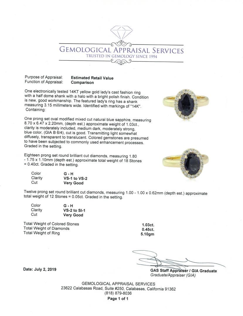 One electronically tested 14KT yellow gold lady's cast fashion ring with a half dome shank with a halo with a bright polish finish. The featured lady's ring has a shank measuring 3.15 millimeters wide. Identified with markings of '14K'. Condition is new, good workmanship. Containing: One prong set oval modified mixed cut natural blue sapphire, measuring 8.70 x 6.47 x 2.20mm, (depth est.) approximate weight of 1.03ct., clarity is moderately included, medium dark, moderately strong, blue color, (GIA B 6/4), cut is good. Transmitting light somewhat diffusely, transparent to translucent. Colored gemstones are presumed to have been subjected to commonly used enhancement processes. Graded in the setting. Eighteen prong set round brilliant cut diamonds, measuring 1.80 - 1.75 x 1.10mm (depth est.) approximate total weight of 18 Stones = 0.40ct. Graded in the setting. Color G - H Clarity VS-1 to VS-2 Cut Very Good Twelve prong set round brilliant cut diamonds, measuring 1.00 - 1.00 x 0.62mm (depth est.) approximate total weight of 12 Stones = 0.05ct. Graded in the setting. Color G - H Clarity VS-2 to SI-1 Cut Very Good. Total Weight of Colored Stones 1.03ct.. Total Weight of Diamonds 0.45ct.. Total Weight of Ring 5.10gm GAS Appraised at $2420.00. GAS Appraised.