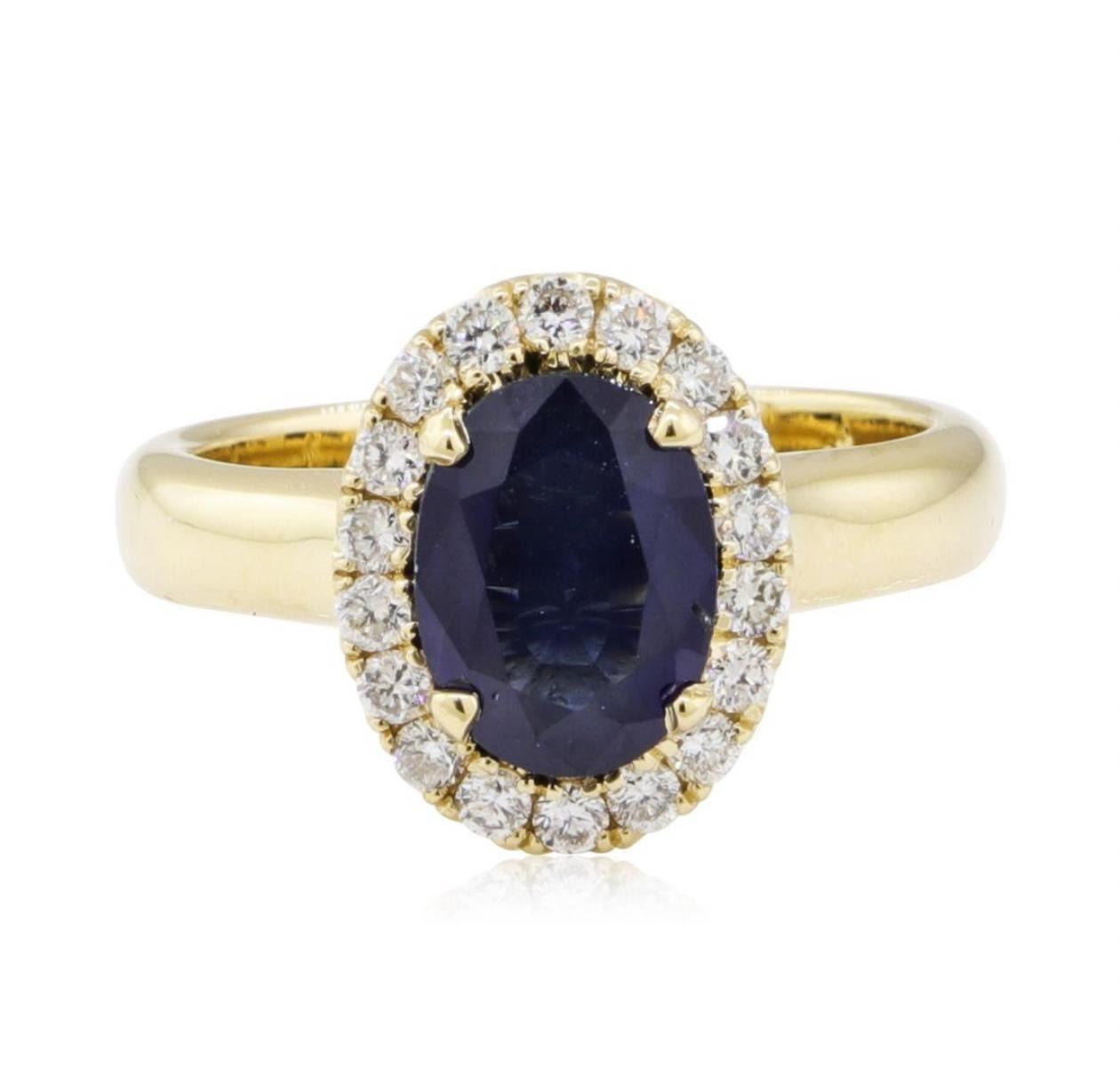 One electronically tested 14KT yellow gold lady's cast fashion ring with a half dome shank with a halo with a bright polish finish. The featured lady's ring has a shank measuring 3.15 millimeters wide. Identified with markings of '14K'. Condition is new, good workmanship. Containing: One prong set oval modified mixed cut natural blue sapphire, measuring 8.70 x 6.47 x 2.20mm, (depth est.) approximate weight of 1.03ct., clarity is moderately included, medium dark, moderately strong, blue color, (GIA B 6/4), cut is good. Transmitting light somewhat diffusely, transparent to translucent. Colored gemstones are presumed to have been subjected to commonly used enhancement processes. Graded in the setting. Eighteen prong set round brilliant cut diamonds, measuring 1.80 - 1.75 x 1.10mm (depth est.) approximate total weight of 18 Stones = 0.40 ct. Graded in the setting. Color G - H Clarity VS-1 to VS-2 Cut Very Good Twelve prong set round brilliant cut diamonds, measuring 1.00 - 1.00 x 0.62mm (depth est.) approximate total weight of 12 Stones = 0.05ct. Graded in the setting. Color G - H Clarity VS-2 to SI-1 Cut Very Good. Total Weight of Colored Stones 1.03ct.. Total Weight of Diamonds 0.45ct.. Total Weight of Ring 5.10gm GAS Appraised at $2420.00. GAS Appraised.