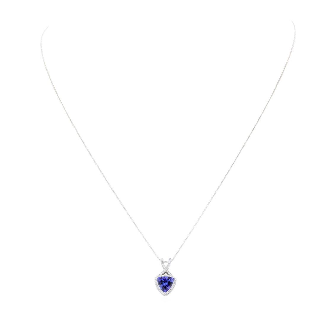 One electronically tested 14KT white gold ladies cast & assembled tanzanite & diamond pendant with chain. The featured tanzanite is set within a diamond bezel with diamond crossing ribbons, completed by a hidden bail. The pendant is supported by an eighteen inch length 14KT white gold link chain, terminating in a spring ring clasp. Bright polish finish. Trademark is Orianne. Identified with markings of "14K". Condition is new, good workmanship. Containing: One prong set triangle mixed cut natural tanzanite, measuring 7.50 x 7.60 x 4.80mm, exact weight 1.48ct., clarity is eye clean, type I, medium dark, very slightly grayish, violetish blue color, (GIA vB 6/3), cut is good. Transmitting light with a minimum of distortion, transparent. Graded in the setting. Tanzanite is a very rare gemstone that is only found in the country of Tanzania. Originally discovered in 1967. Tiffany & Company, named the stone Tanzanite. It is found in the Usumburu Mountains that border the Umba Valley of northern Tanzania. Tanzanite occurs in gray, brown, violet, blue, reddish-purple, & green. The gem is interesting because of its exceptional pleochroism. Rotated in different directions a tanzanite will exhibit multiple changes of color. Tanzanite has a low tolerance to ultrasonic cleaning, and should not be cleaned using this method. Thirty-Nine prong set round brilliant cut diamonds exact total weight 39 Stones = 0.20ct. The clarity & color grade reflect the overall average for the group. Graded in the setting. Clarity SI-2 to I-2 Color F - H Total Weight of Colored Stones 1.48 ct. Total Weight of Diamonds 0.20 ct. Total Weight of Pendant With Chain 2.60 gm Estimated Retail Value $ 4,375.00 US
