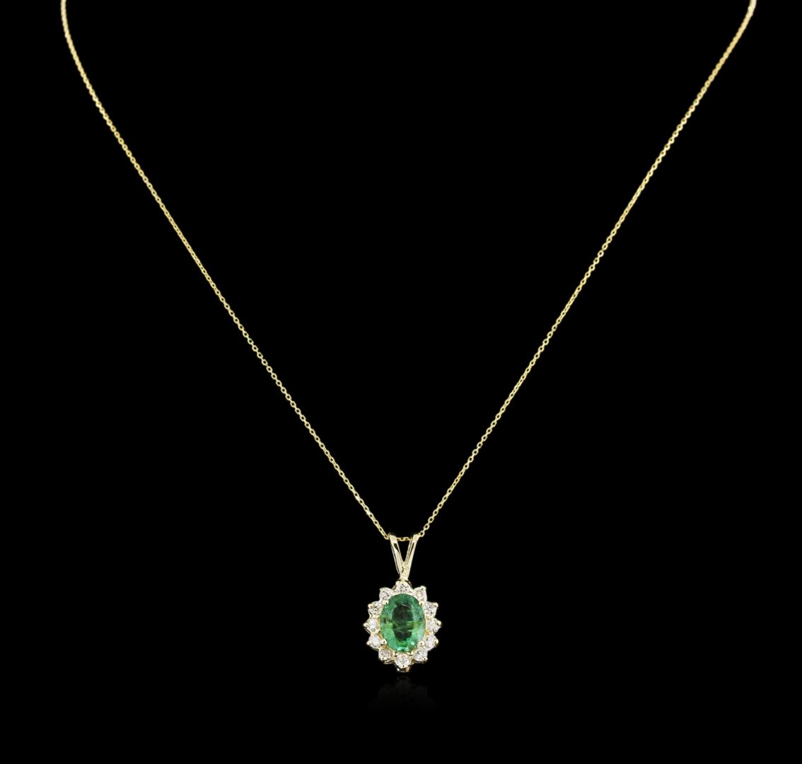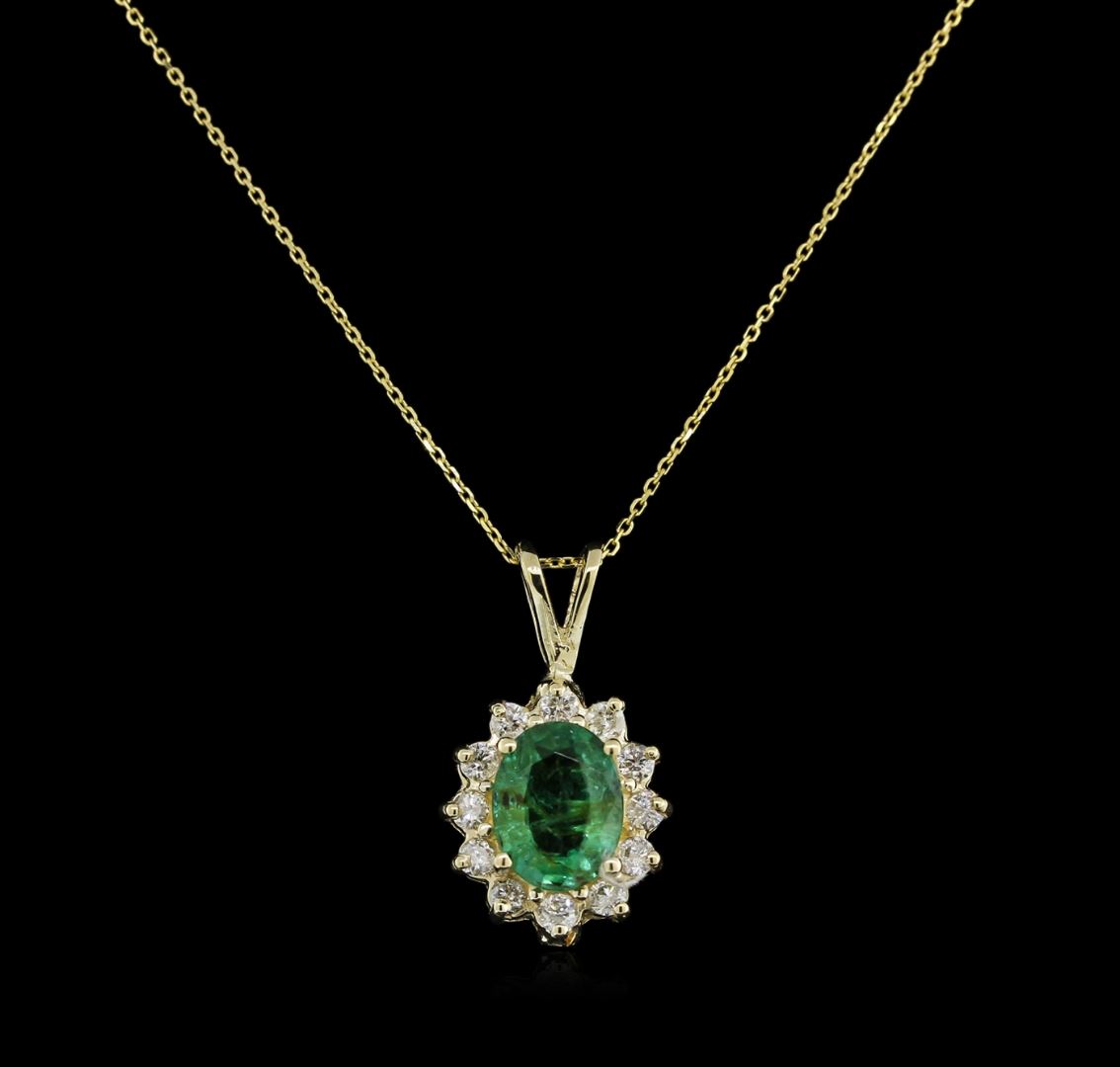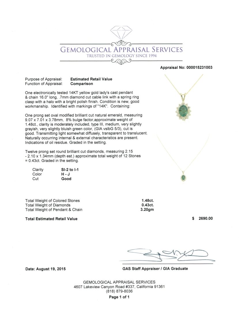 One electronically tested 14KT yellow gold lady's cast pendant & chain 16.0" long,.7mm diamond cut cable link with a spring ring clasp with a halo with a bright polish finish. Identified with markings of "14K". Condition is new, good workmanship. Containing: One prong set oval modified brilliant cut natural emerald, measuring 9.07 x 7.01 x 3.78mm, 8% bulge factor, approximate weight of 1.48ct., clarity is moderately included, type III, medium, very slightly grayish, very slightly bluish green color, (GIA vslbG 5/3), cut is good. Transmitting light somewhat diffusely, transparent to translucent. Naturally occurring internal & external characteristics are present. Indications of oil residue. Graded in the setting. Twelve prong set round brilliant cut diamonds, measuring 2.15 - 2.10 x 1.34mm (depth est.) approximate total weight of 12 Stones = 0.43ct. Graded in the setting. Clarity: SI-2 to I-1. Color: H - J. Cut Good. Total Weight of Colored Stones 1.48ct. Total Weight of Diamonds 0.43ct. Total Weight of Pendant & Chain 3.20gm. GAS Appraised at $2,690.00.