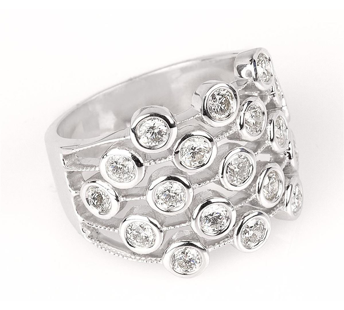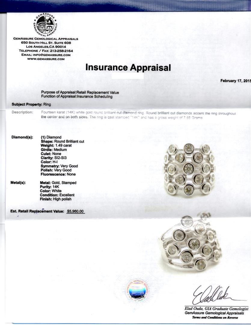 Fourteen karat (14K) white gold round brilliant cut diamond ring. Round brilliant cut diamonds accent the ring throughout the center and on both sides. The ring is cast stamped "14K" and has a gross weight of 7.65 Grams. Diamond(s): Diamond. Shape: Round Brilliant cut. Weight: 1.49 carat. Girdle: Medium. Culet: None. Clarity: SI2-SI3. Color: H-I. Symmetry: Very Good. Polish: Very Good. Fluorescence: None. Metal(s): Metal: Gold, Stamped. Purity: 14K. Color: White. Condition: Excellent. Finish: High polish. GGA Appraised at $5,960.00.