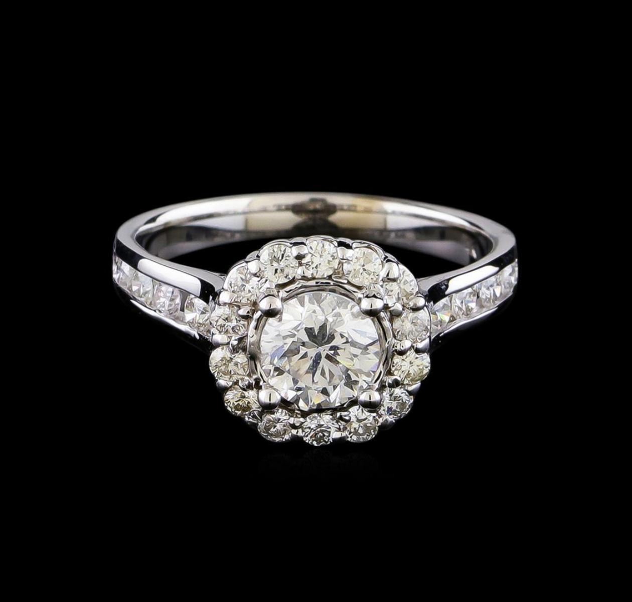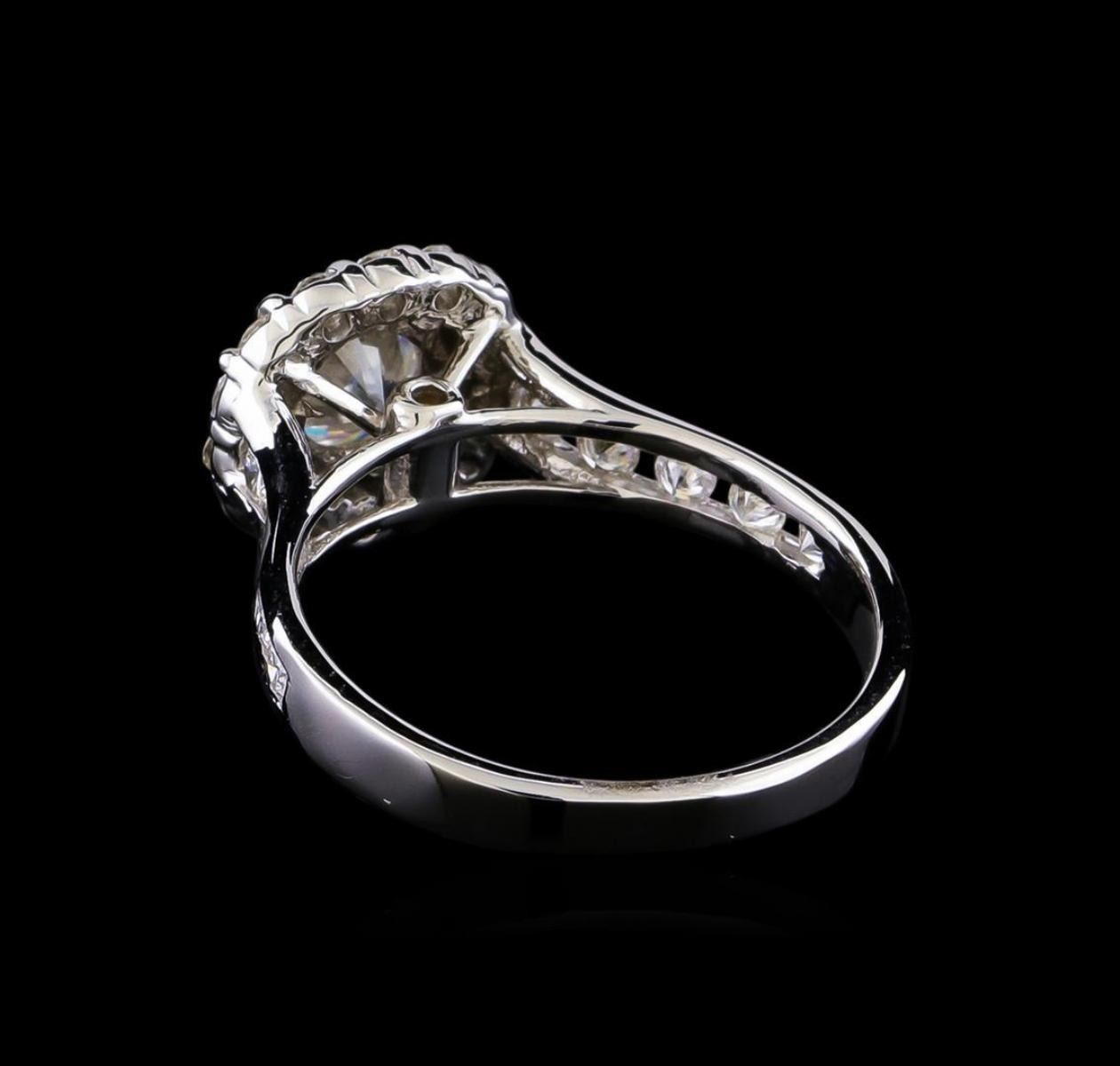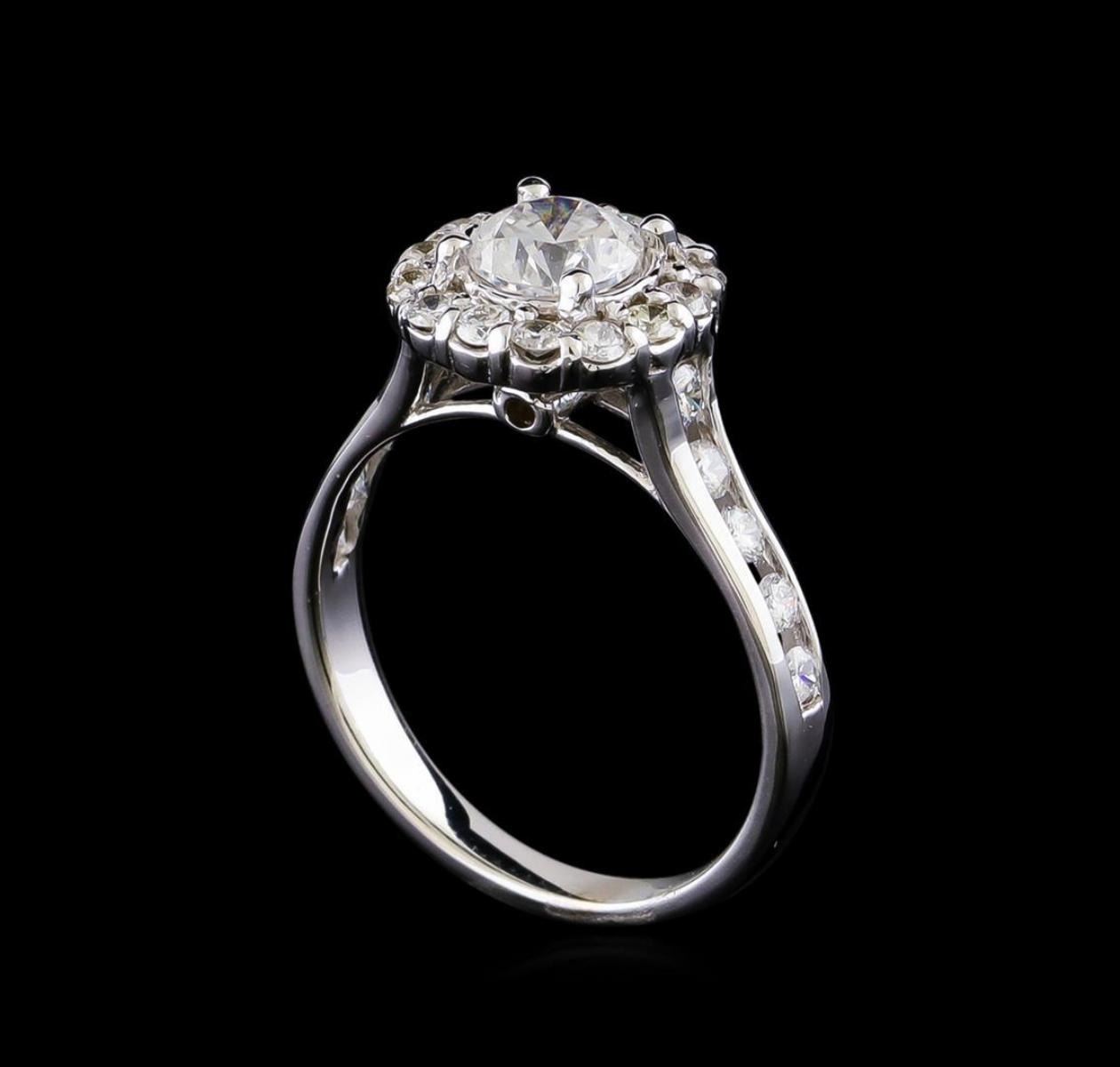One electronically tested 14KT white gold lady's cast wedding ring with a cathedral halo with a bright polish finish. The featured lady's ring has a shank measuring 2.52 millimeters in width. Identified with markings of "14K". Condition is new, good workmanship. Containing: One prong set round brilliant cut diamond, measuring 5.72 - 5.65 x 3.68mm (depth est.) , 10.00.%. GTCF approximate weight of 0.84ct. Graded in the setting. Clarity: SI-2. Color: H - I. Cut Good Fourteen prong set round brilliant cut diamonds, measuring 1.80 - 1.75 x 1.10mm (depth est.) approximate total weight of 14 Stones = 0.33ct. Graded in the setting. Clarity: SI-1 to SI-2. Color: H - I. Cut Good Ten channel set round brilliant cut diamonds, measuring 2.00 - 1.95 x 1.25mm (depth est.) approximate total weight of 10 Stones = 0.32ct. Graded in the setting. Clarity: SI-1 to SI-3. Color: H - I. Cut Good. Total Weight of Diamonds 1.49ct. Total Weight of Ring 3.70gm. GAS Appraised.