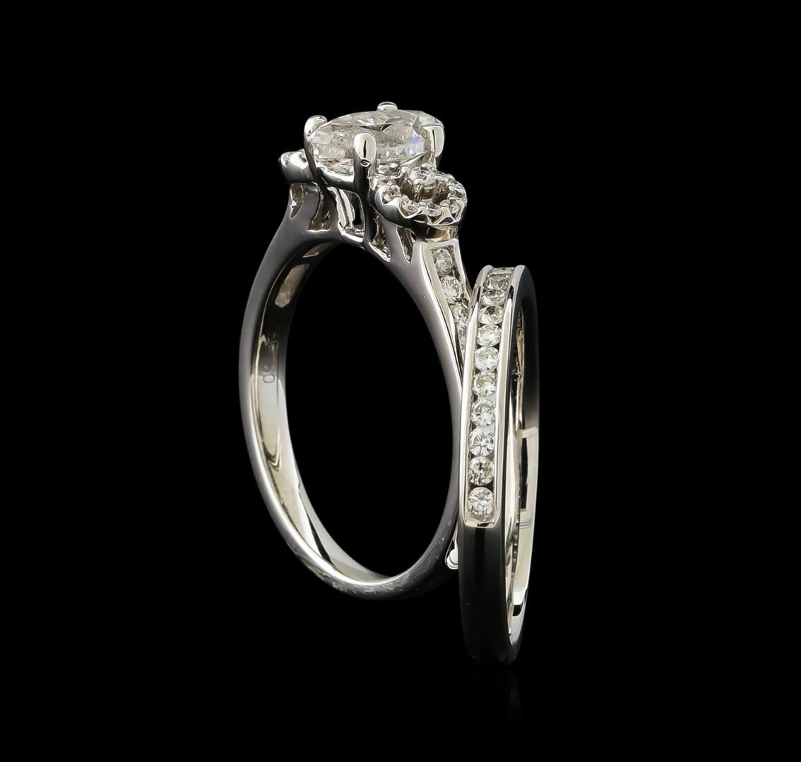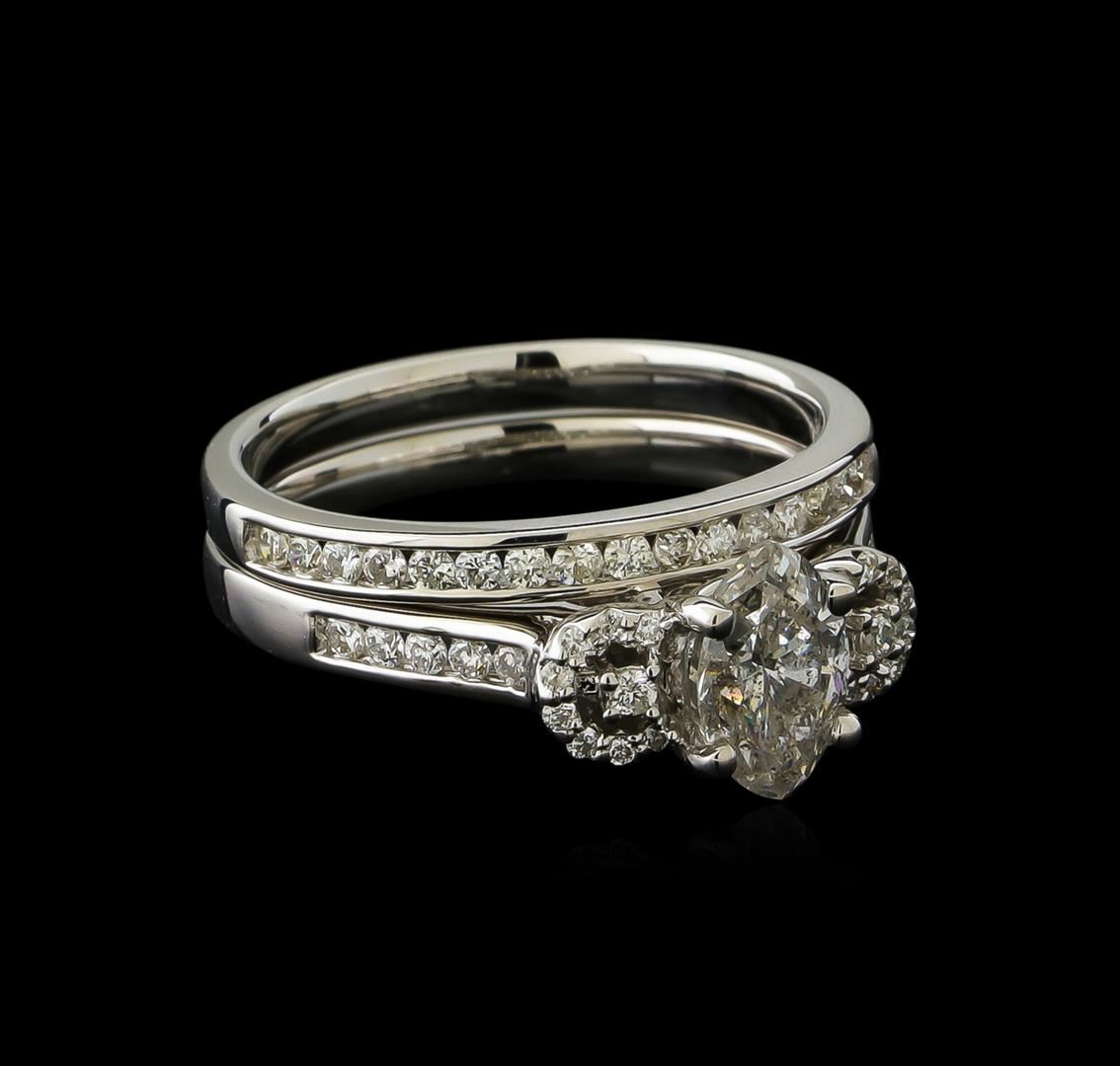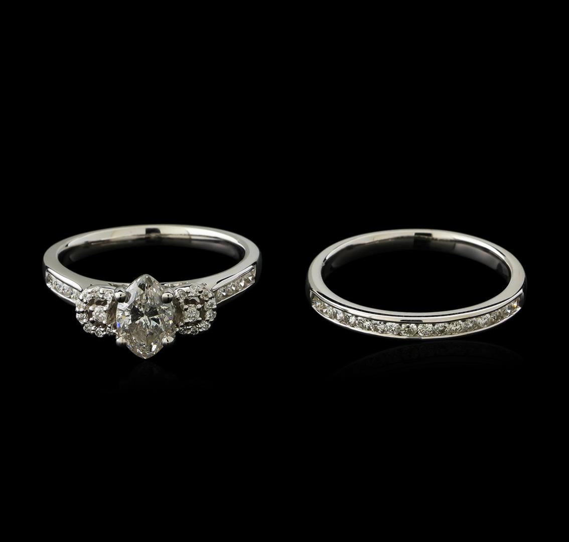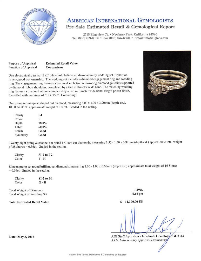 One electronically tested 18KT white gold ladies cast diamond unity wedding set. The wedding set includes a diamond engagement ring and wedding ring. The engagement ring features a diamond set between mirroring diamond galleries supported by diamond ribbon shoulders, completed by a two millimeter wide band. The matching wedding ring features a diamond ribbon completed by a two millimeter wide band. Bright polish finish. Identified with markings of "18K 750". Condition is new, good workmanship. Containing: One prong set marquise shaped cut diamond, measuring 8.00 x 5.00 x 3.90mm (depth est.), 10.00.%. GTCF approximate weight of 1.07ct. Graded in the setting. Clarity: I-1. Color: 78.0%. Table 60.0%. Twenty-Eight prong & channel set round brilliant cut diamonds, measuring 1.55 - 1.50 x 0.92mm (depth est.) approximate total weight of 28 Stones = 0.36ct. Graded in the setting. Clarity: SI-2 to I-2. Color: F - H Sixteen prong set round brilliant cut diamonds, measuring 1.00 - 1.00 x 0.60mm (depth est.) approximate total weight of 16 Stones = 0.06ct. Graded in the setting. Clarity: SI-2 to I-1. Color: G - H. Total Weight of Diamonds 1.49ct. Total Weight of Wedding Set 6.16gm. AIG Appraised at $11,390.00.