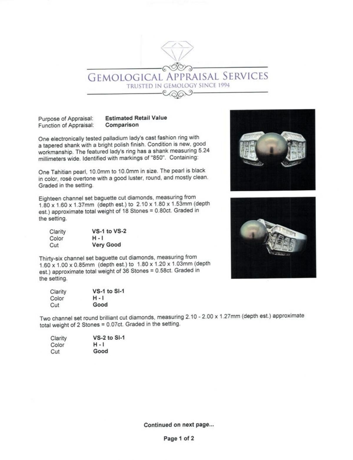 One electronically tested palladium lady's cast fashion ring with a tapered shank with a bright polish finish. The featured lady's ring has a shank measuring 5.24 millimeters wide. Identified with markings of '850'. Condition is new, good workmanship. Containing: One Tahitian pearl, 10.0mm to 10.0mm in size. The pearl is black in color, ros� overtone with a good luster, round, and mostly clean. Graded in the setting. Eighteen channel set baguette cut diamonds, measuring from 1.80 x 1.60 x 1.37mm (depth est.) to 2.10 x 1.80 x 1.53mm (depth est.) approximate total weight of 18 Stones = 0.80ct. Graded in the setting. Color H - I Clarity VS-1 to VS-2 Cut Very Good Thirty-Six channel set baguette cut diamonds, measuring from 1.60 x 1.00 x 0.85mm (depth est.) to 1.80 x 1.20 x 1.03mm (depth est.) approximate total weight of 36 Stones = 0.58ct. Graded in the setting. Color H - I Clarity VS-1 to SI-1 Cut Good Two channel set round brilliant cut diamonds, measuring 2.10 - 2.00 x 1.27mm (depth est.) approximate total weight of 2 Stones = 0.07ct. Graded in the setting. Color H - I Clarity VS-2 to SI-1 Cut Good Four channel set round brilliant cut diamonds, measuring 1.40 - 1.30 x 0.81mm (depth est.) approximate total weight of 4 Stones = 0.04ct. Graded in the setting. Color H - I Clarity VS-2 to SI-1 Cut Very Good. Total Weight of Diamonds 1.49ct.. Total Weight of Ring 10.40gm. GAS Appraised.