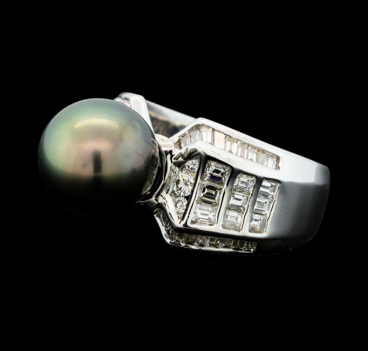 One electronically tested palladium lady's cast fashion ring with a tapered shank with a bright polish finish. The featured lady's ring has a shank measuring 5.24 millimeters wide. Identified with markings of '850'. Condition is new, good workmanship. Containing: One Tahitian pearl, 10.0mm to 10.0mm in size. The pearl is black in color, ros� overtone with a good luster, round, and mostly clean. Graded in the setting. Eighteen channel set baguette cut diamonds, measuring from 1.80 x 1.60 x 1.37mm (depth est.) to 2.10 x 1.80 x 1.53mm (depth est.) approximate total weight of 18 Stones = 0.80 ct. Graded in the setting. Color H - I Clarity VS-1 to VS-2 Cut Very Good Thirty-Six channel set baguette cut diamonds, measuring from 1.60 x 1.00 x 0.85mm (depth est.) to 1.80 x 1.20 x 1.03mm (depth est.) approximate total weight of 36 Stones = 0.58ct. Graded in the setting. Color H - I Clarity VS-1 to SI-1 Cut Good Two channel set round brilliant cut diamonds, measuring 2.10 - 2.00 x 1.27mm (depth est.) approximate total weight of 2 Stones = 0.07ct. Graded in the setting. Color H - I Clarity VS-2 to SI-1 Cut Good Four channel set round brilliant cut diamonds, measuring 1.40 - 1.30 x 0.81mm (depth est.) approximate total weight of 4 Stones = 0.04ct. Graded in the setting. Color H - I Clarity VS-2 to SI-1 Cut Very Good. Total Weight of Diamonds 1.49ct.. Total Weight of Ring 10.40gm. GAS Appraised.