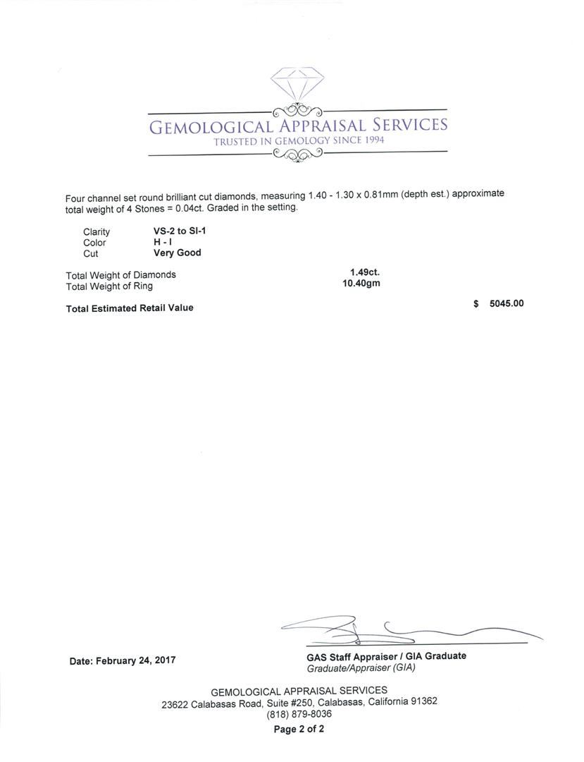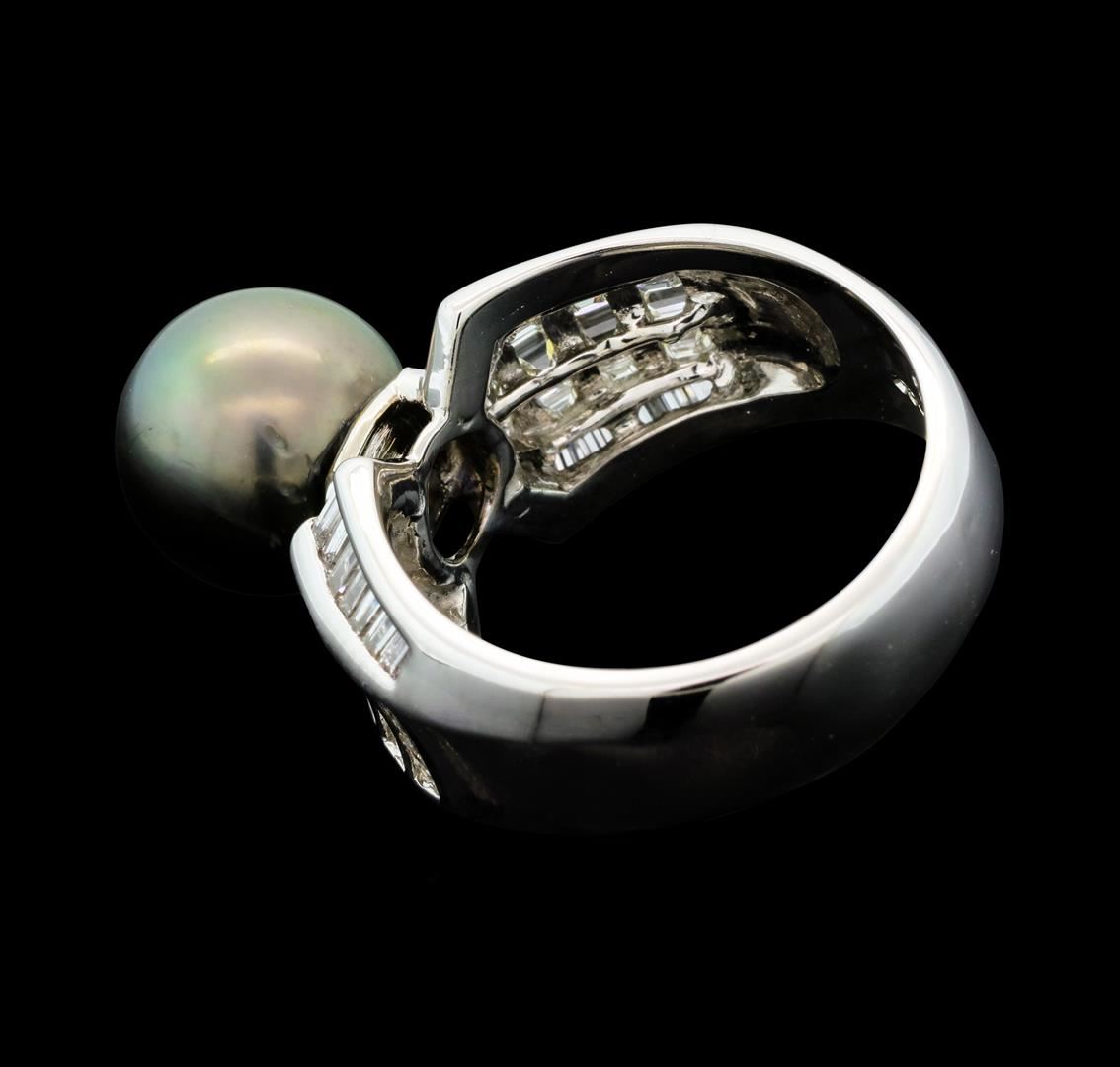 One electronically tested palladium lady's cast fashion ring with a tapered shank with a bright polish finish. The featured lady's ring has a shank measuring 5.24 millimeters wide. Identified with markings of '850'. Condition is new, good workmanship. Containing: One Tahitian pearl, 10.0mm to 10.0mm in size. The pearl is black in color, ros� overtone with a good luster, round, and mostly clean. Graded in the setting. Eighteen channel set baguette cut diamonds, measuring from 1.80 x 1.60 x 1.37mm (depth est.) to 2.10 x 1.80 x 1.53mm (depth est.) approximate total weight of 18 Stones = 0.80 ct. Graded in the setting. Color H - I Clarity VS-1 to VS-2 Cut Very Good Thirty-Six channel set baguette cut diamonds, measuring from 1.60 x 1.00 x 0.85mm (depth est.) to 1.80 x 1.20 x 1.03mm (depth est.) approximate total weight of 36 Stones = 0.58ct. Graded in the setting. Color H - I Clarity VS-1 to SI-1 Cut Good Two channel set round brilliant cut diamonds, measuring 2.10 - 2.00 x 1.27mm (depth est.) approximate total weight of 2 Stones = 0.07ct. Graded in the setting. Color H - I Clarity VS-2 to SI-1 Cut Good Four channel set round brilliant cut diamonds, measuring 1.40 - 1.30 x 0.81mm (depth est.) approximate total weight of 4 Stones = 0.04ct. Graded in the setting. Color H - I Clarity VS-2 to SI-1 Cut Very Good. Total Weight of Diamonds 1.49ct.. Total Weight of Ring 10.40gm. GAS Appraised.