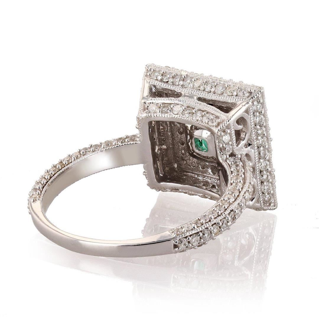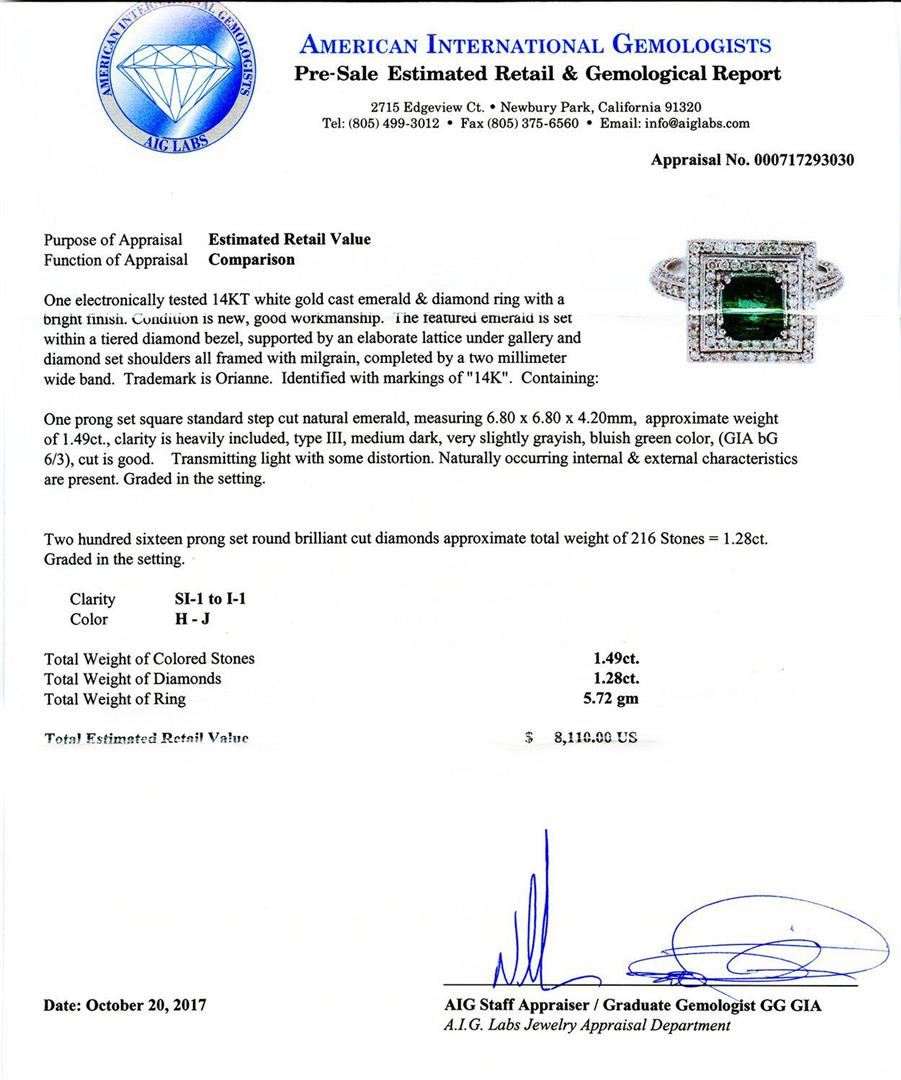 1.49ct Emerald and 1.28ctw Diamond 14K White Gold Ring. One electronically tested 14KT white gold cast emerald and diamond ring with a bright finish. Condition is new, goon workmanship. The featured emerald is set within a tiered diamond bezel, supported by an elaborate lattice under gallery and diamond set shoulders all framed with milgrain, completed by a two millimeter wide band. Trademark is Orianne. Identified with markings of "14K". Containing: One prong set square standard step cut natural emerald, measuring 6.80 x 6.80 x 4.20mm, approximate weight of 1.49ct., clarity is heavily included, type III, medium dark, very slightly grayish, bluish green color, (GIA bG 6/3), cut is good. Transmitting light with some distortion. Naturally occurring internal & external characteristics are present. Graded in the setting. Two hundred sixteen prong set round brilliant cut diamonds approximate total weight of 216 Stones = 1.28ctw. Graded in the setting. Clarity SI-1 to I-1 Color H - J Total Weight of Colored Stones 1.49ct. Total Weight of Diamonds 1.28ctw. Total Weight of Ring 5.72 gm