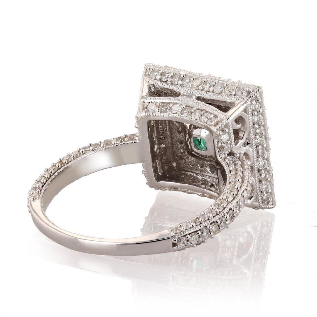 One electronically tested 14KT white gold cast emerald and diamond ring with a bright finish. Condition is new, goon workmanship. The featured emerald is set within a tiered diamond bezel, supported by an elaborate lattice under gallery and diamond set shoulders all framed with milgrain, completed by a two millimeter wide band. Trademark is Orianne. Identified with markings of "14K". Containing: One prong set square standard step cut natural emerald, measuring 6.80 x 6.80 x 4.20mm, approximate weight of 1.49ct., clarity is heavily included, type III, medium dark, very slightly grayish, bluish green color, (GIA bG 6/3), cut is good. Transmitting light with some distortion. Naturally occurring internal & external characteristics are present. Graded in the setting. Two hundred sixteen prong set round brilliant cut diamonds approximate total weight of 216 Stones = 1.28ctw. Graded in the setting. Clarity SI-1 to I-1 Color H - J Total Weight of Colored Stones 1.49ct. Total Weight of Diamonds 1.28ctw. Total Weight of Ring 5.72 gm Size: 7