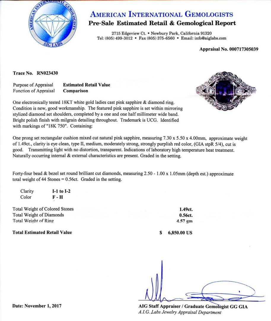 One electronically tested 18KT white gold ladies cast pink sapphire and diamond ring. Condition is new, good workmanship. The featured pink sapphire is set within mirroring stylized diamond set shoulders, completed by a one and one half millimeter wide band. Bright polish finish with milgrain detailing throughout. Trademark is UCG. Identified with markings of "18K 750". Containing: One prong set rectangular cushion mixed cut natural pink sapphire, measuring 7.30 x 5.50 x 4.00mm, approximate weight of 1.49ct., clarity is eye clean, type II, medium, moderately strong, strongly purplish red color, (GIA stpR 5/4), cut is good. Transmitting light with no distortion, transparent. Indications of laboratory high temperature heat treatment. Naturally occurring internal and external characteristics are present. Graded in the setting. Forty-four bead and bezel set round brilliant cut diamonds, measuring 2.50 - 1.00 x 1.05mm (depth est.) approximate total weight of 44 Stones = 0.56ct. Graded in the setting. Clarity I1 to I2 Color F - H Total Weight of Colored Stones 1.49ct. Total Weight of Diamonds 0.56ct. Total Weight of Ring 4.57 gm Total Estimated Retail Value $ 6,850.00 US Date: November 1, 2017 MG Staff Appraiser / Graduate Gemo ogist GG GIA A.I.G. Labs Jewelry Appraisal Department #Size: 6 1/4