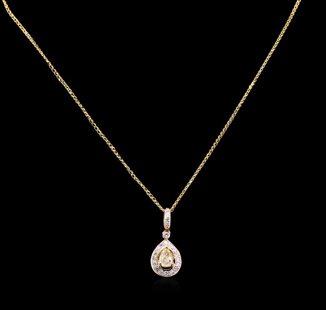 One electronically tested 14KT yellow gold ladies cast & assembled diamond pendant and chain. Condition is new, good workmanship. The pendant features a pear shaped diamond set in a gallery of round brilliant diamonds, completed by a diamond set bail. The pendant is supported by an eighteen inch length designer style chain, terminating in a lobster claw clasp. Bright polish finish. Identified with markings of "14K". Containing: One prong set pear shaped cut diamond, measuring 7.00 x 5.30 x 3.45mm, 21.00% GTCF exact weight 1.00ct with a medium blue fluorescence. Graded in the setting. Clarity: SI-1. Depth: 65.1%. Table 66.0%. Twenty-Three prong set round brilliant cut diamonds, measuring 1.80 - 1.80 x 1.08mm exact total weight 23 Stones = 0.49ct. Graded in the setting. Clarity: SI-2 to I-1. Color: G - I. Total Weight of Diamonds 1.49ct. Total Weight of Pendant And Chain 4.66gm. AIG Appraised at $7,005.00.