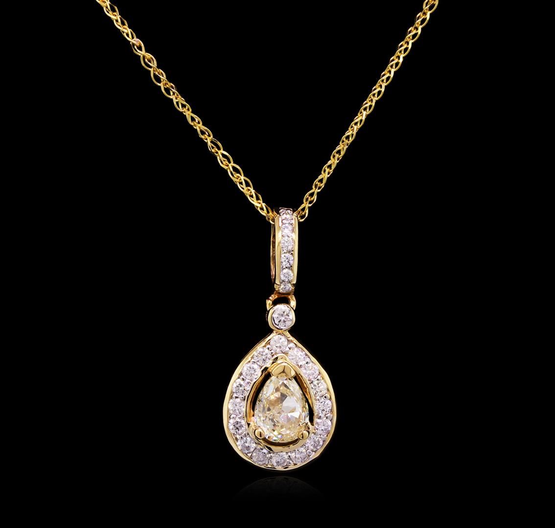 One electronically tested 14KT yellow gold ladies cast & assembled diamond pendant and chain. Condition is new, good workmanship. The pendant features a pear shaped diamond set in a gallery of round brilliant diamonds, completed by a diamond set bail. The pendant is supported by an eighteen inch length designer style chain, terminating in a lobster claw clasp. Bright polish finish. Identified with markings of "14K". Containing: One prong set pear shaped cut diamond, measuring 7.00 x 5.30 x 3.45mm, 21.00% GTCF exact weight 1.00ct with a medium blue fluorescence. Graded in the setting. Clarity: SI-1. Depth: 65.1%. Table 66.0%. Twenty-Three prong set round brilliant cut diamonds, measuring 1.80 - 1.80 x 1.08mm exact total weight 23 Stones = 0.49ct. Graded in the setting. Clarity: SI-2 to I-1. Color: G - I. Total Weight of Diamonds 1.49ct. Total Weight of Pendant And Chain 4.66gm. AIG Appraised at $7,005.00.