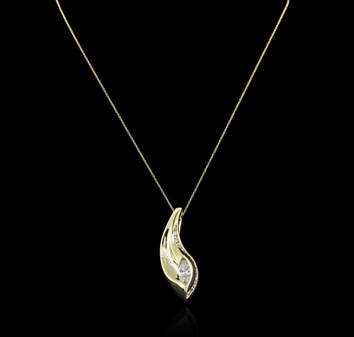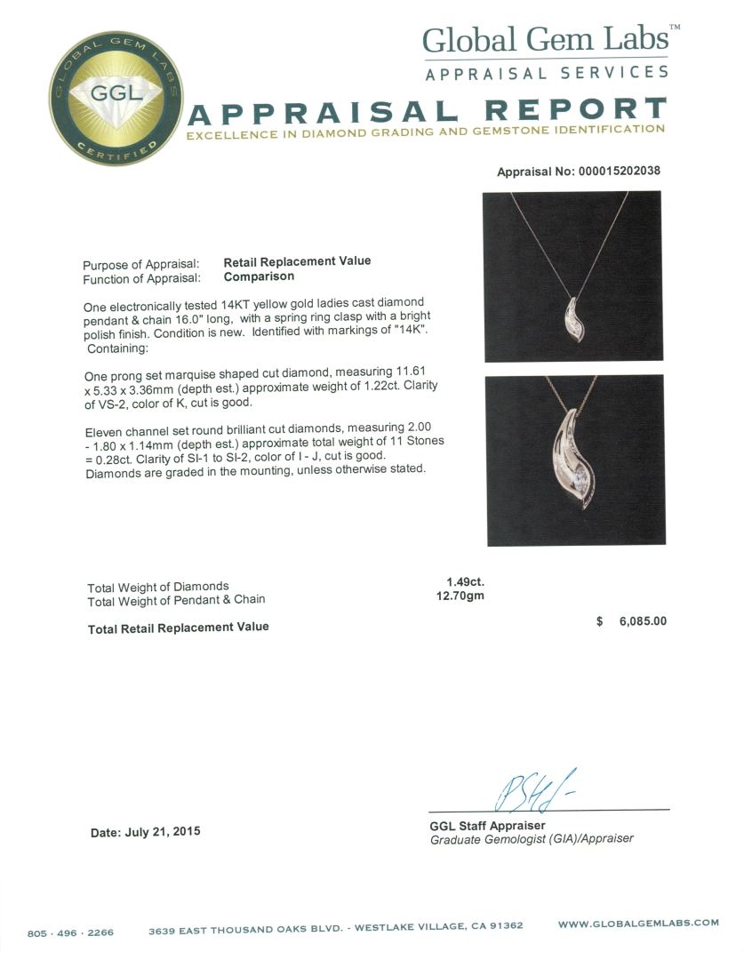 One electronically tested 14KT yellow gold ladies cast diamond pendant & chain 16.0" long, with a spring ring clasp with a bright polish finish. Identified with markings of "14K". Condition is new. Containing: One prong set marquise shaped cut diamond, measuring 11.61 x 5.33 x 3.36mm (depth est.) approximate weight of 1.22ct. Clarity: VS-2. Color: K, Cut is Good. Eleven channel set round brilliant cut diamonds, measuring 2.00 - 1.80 x 1.14mm (depth est.) approximate total weight of 11 Stones = 0.28ct. Clarity: SI-1 to SI-2. Color: I - J, Cut is Good. Diamonds are graded in the mounting, unless otherwise stated. Total Weight of Diamonds 1.49ct. Total Weight of Pendant & Chain 12.70gm. GGL Appraised at $6,085.00.