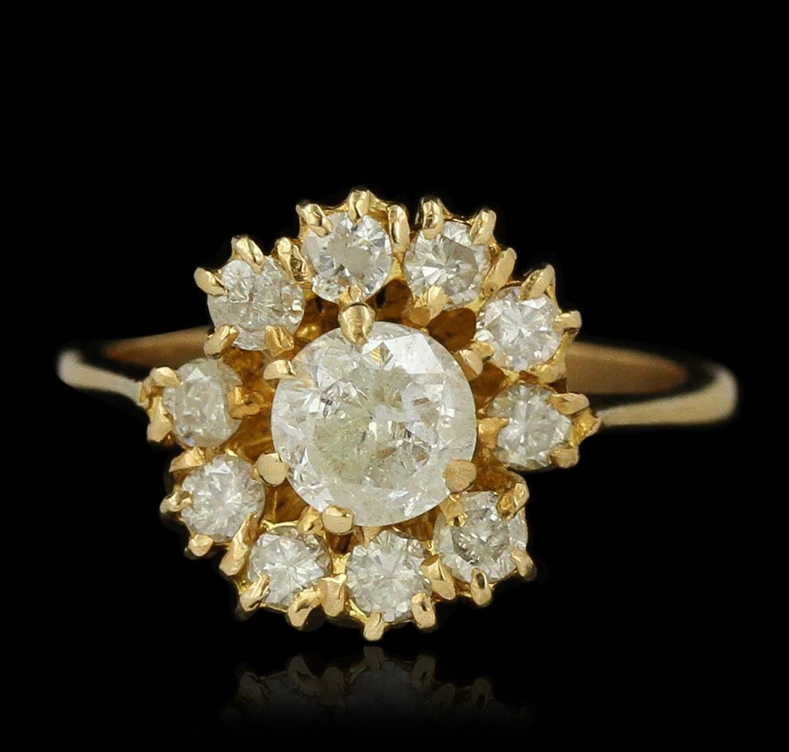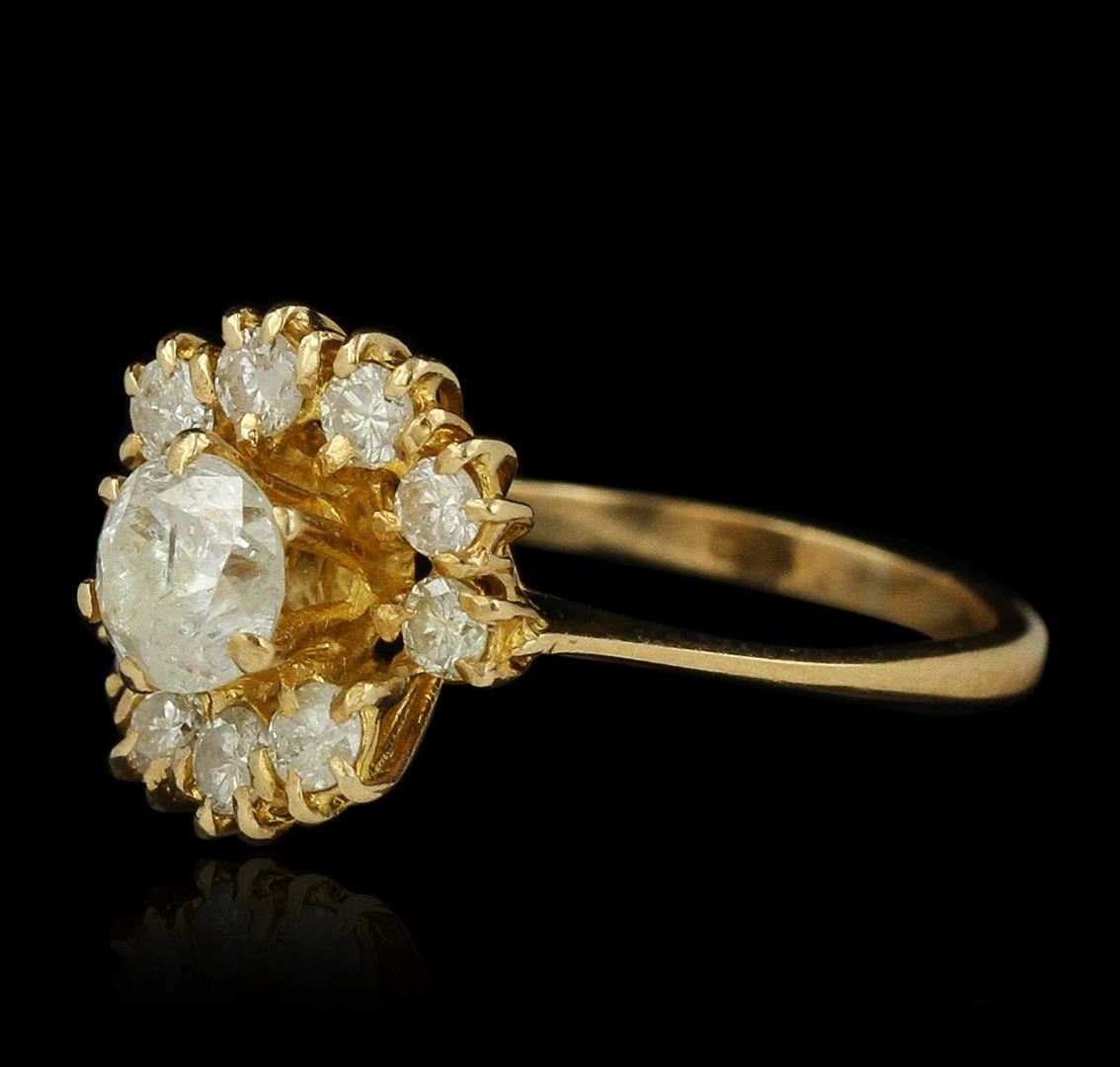18KT Yellow Gold 1.49ctw Diamond Engagement Ring A8411. Very Good Condition! FV409GB. One electronically tested 18KT yellow gold lady's combination cast & assembled engagement ring with a bright polish finish. Condition is very good. Containing: One prong set Old European cut diamond, measuring 5.70 - 5.70 x 3.90mm (depth est.) approximate weight of 0.77ct. Clarity: I-3. Color: K, Cut is Fair. Ten prong set round brilliant cut diamonds, measuring 2.50 - 2.50 x 1.88mm (depth est.) approximate. Total Weight of 10 Stones = 0.72ct. Clarity: I-1 to I-2. Color: J - K, Cut is Good. Total Weight of Diamonds 1.49ct. Total Weight of Ring 3.50gm. GGL Appraised at $5,540.00. GGL Appraised.