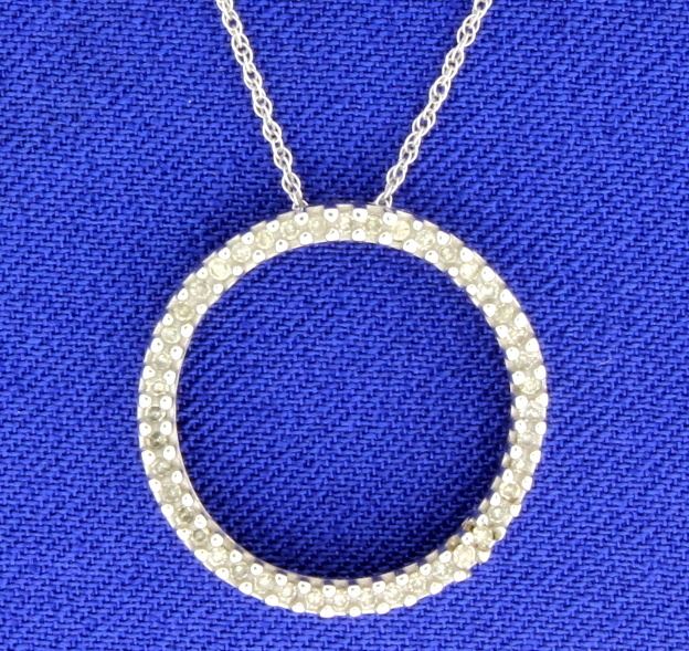 In 10K white gold, this chain is 18 inches long and the pendant is 3/4 inch in diameter and contains 1/4ct total weight of round diamonds. 2.5g