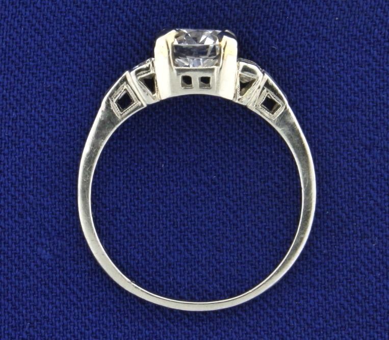 In platinum. Center Diamond is Very High Quality Round Brilliant, 1.1 ct, VVS clarity, G color, excellent cut with lots of sparkle and brilliance. Also contains 4 Baguette cut diamonds surrounding it, total weight of .3 ct, of similar very high quality. Size 6. 3.2g