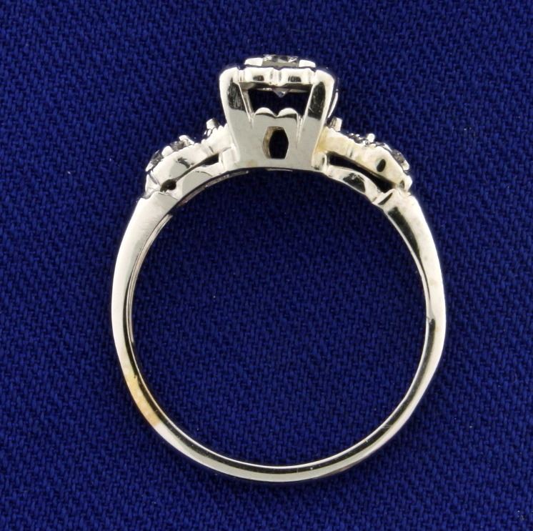 In 14k yellow gold, center diamond is high quality .17ct diamond surrounded by two .04ct diamonds. Color G/I1 clarity. Size 6. 2.8g.