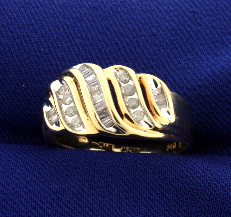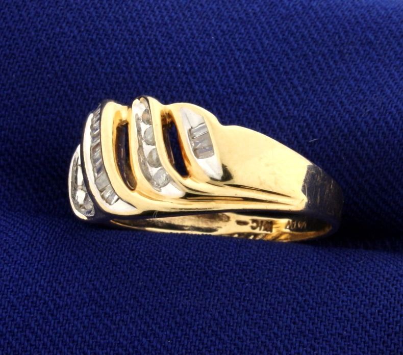 In 10k yellow gold, containing 1/4ct of baguette and round diamonds. Unique wave pattern. Size 7 1/2. 3.2g.