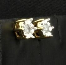 In 10K yellow & white gold, the earrings have 1/4ct total weight of I clarity/H color diamonds. They have friction backs. 1.1g