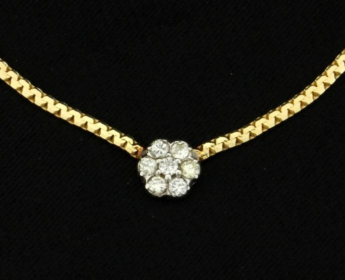 In 14K yellow and white gold, the necklace contains 1/4ct total weight of diamonds and is 15 1/2 inches long with a plunger clasp. 4.1g