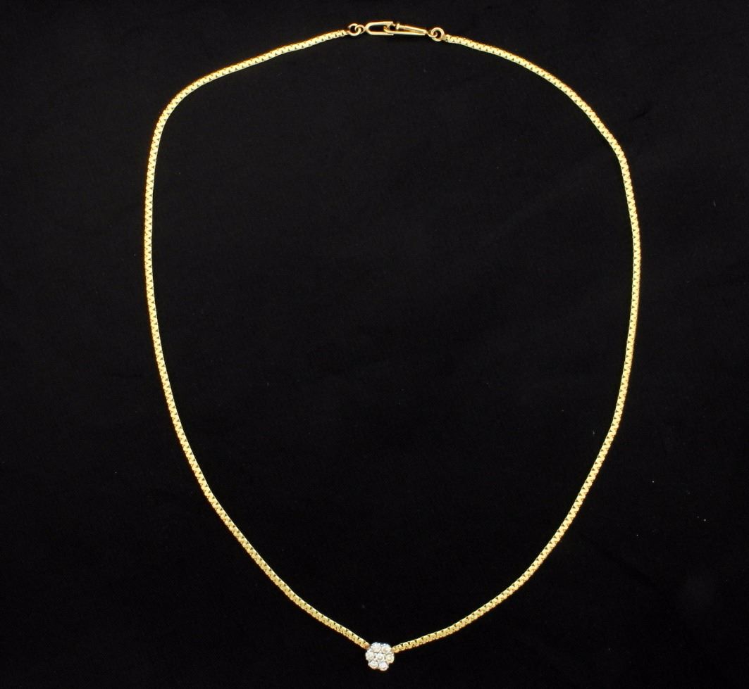 In 14K yellow and white gold, the necklace contains 1/4ct total weight of diamonds and is 15 1/2 inches long with a plunger clasp. 4.1g