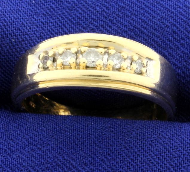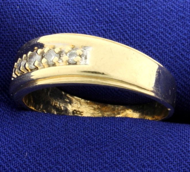 In 14K yellow gold is contains one .09ct, two .05ct, & two .03ct diamonds-All I clarity/ H color. Size 10 7.1g