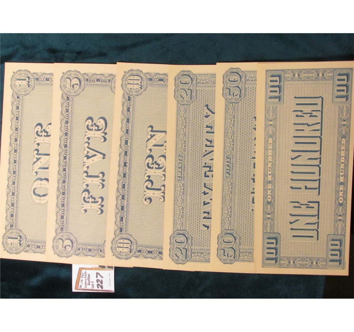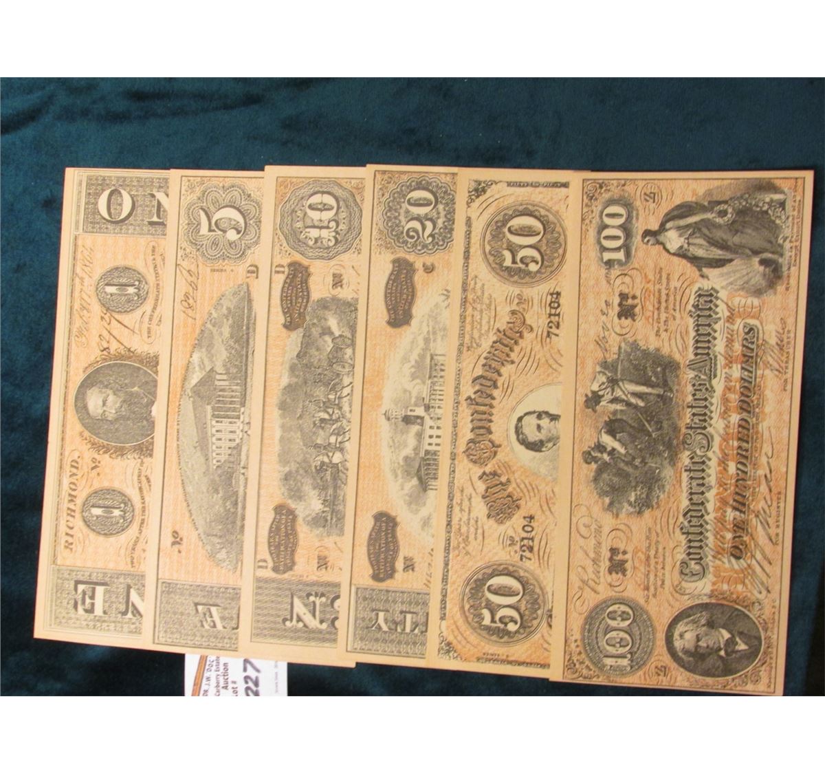 $1, $5, $10, $20, $50, & $100 facsimile "The Confederate States of America" Bank notes. 'Doc' had noted that these were cereal give-a-way notes. All Crisp Unc. (6 pcs.).