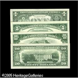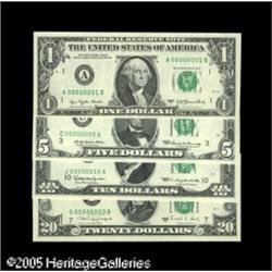 <B>$1, $5, $10, $20 FRN Denomination Serial Number Set.</B></I><BR>Fr. 1909-A $1 1977 Federal Reserve Note. Choice CU<BR>Fr. 1969-C $5 1969 Federal Reserve Note. Choice CU<BR>Fr. 2016-J $10 1963 Federal Reserve Note. Choice CU<BR>Fr. 2076-G $20 1988-A Federal Reserve Note. Gem CU.<BR>Each note in this lot sports a serial number that matches its denomination. This type of set is rarely, if ever, seen in the marketplace.<BR> 4 notes Lot:15809