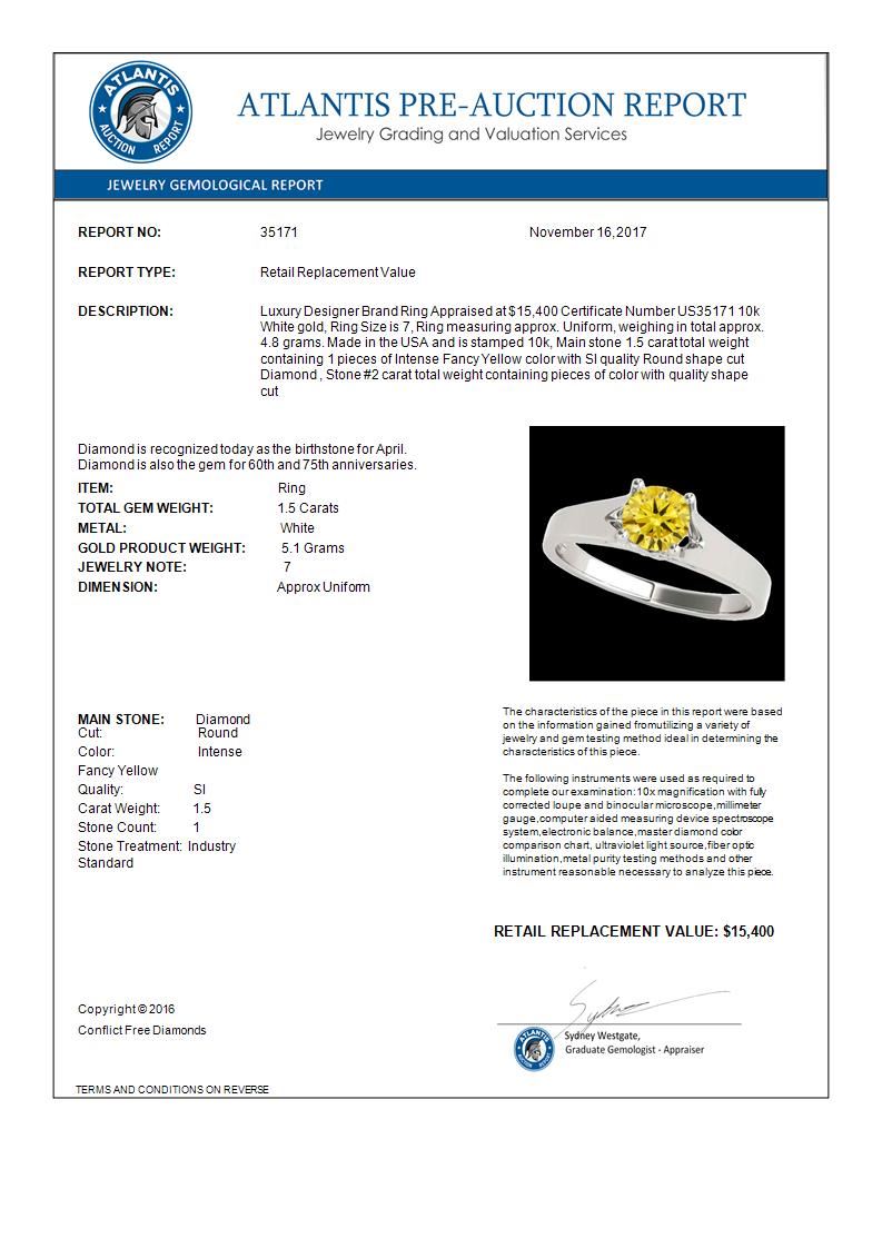 REF-254Y5K -35171 ---- 1.5 CTW Certified Si/I Fancy Intense Yellow Diamond Solitaire Ring 10K White Gold ---- Luxury Designer Brand Ring Appraised at $15,400 Certificate Number US35171 10k White gold, Ring Size is 7, Ring measuring approx. Uniform, weighing in total approx. 4.8 grams. Made in the USA and is stamped 10k, Main stone 1.5 carat total weight containing 1 pieces of Intense Fancy Yellow color with SI quality Round shape cut Diamond , Stone #2 carat total weight containing pieces of color with quality shape cut
