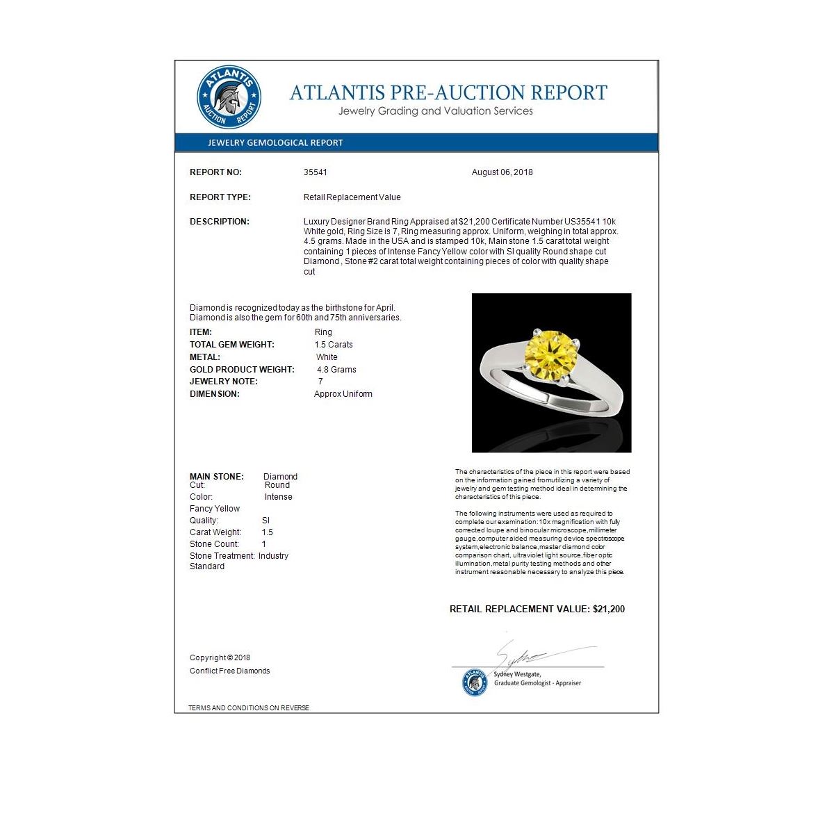 REF-350W2F -35541 ---- 1.5 CTW Certified Si/I Fancy Intense Yellow Diamond Solitaire Ring 10K White Gold ---- Luxury Designer Brand Ring Appraised at $21,200 Certificate Number US35541 10k White gold, Ring Size is 7, Ring measuring approx. Uniform, weighing in total approx. 4.5 grams. Made in the USA and is stamped 10k, Main stone 1.5 carat total weight containing 1 pieces of Intense Fancy Yellow color with SI quality Round shape cut Diamond , Stone #2 carat total weight containing pieces of color with quality shape cut