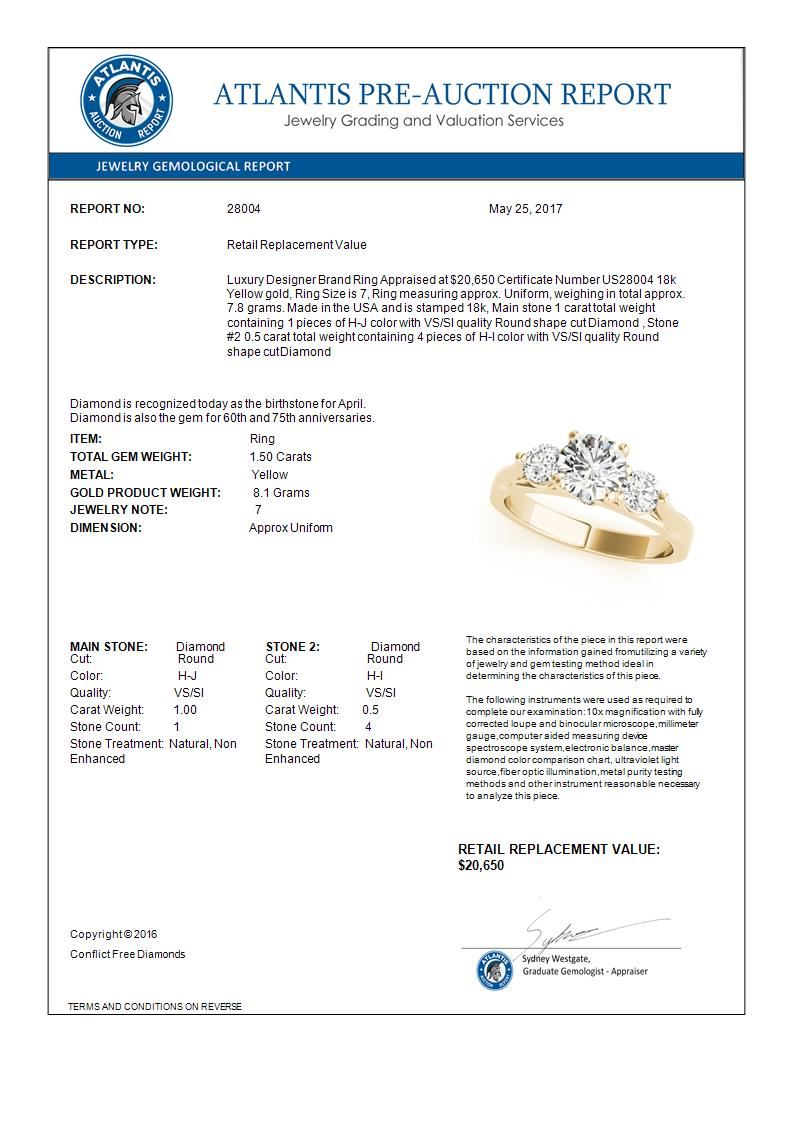 1.5 CTW Certified VS/SI Diamond 3 Stone Ring 18K Yellow Gold ---- Luxury Designer Brand Ring Appraised Retail Price at $20,650 ---- SKU Number US28004 18k Yellow gold Ring Size is 7, Ring measuring approx. Uniform, weighing in total approx. 7.8 grams. Made in the USA and is stamped 18k, Main stone 1.00 carat total weight containing 1 pieces of H-J color with VS/SI quality Round shape cut Diamond , Stone #2 0.5 carat total weight containing 4 pieces of H-I color with VS/SI quality Round shape cut