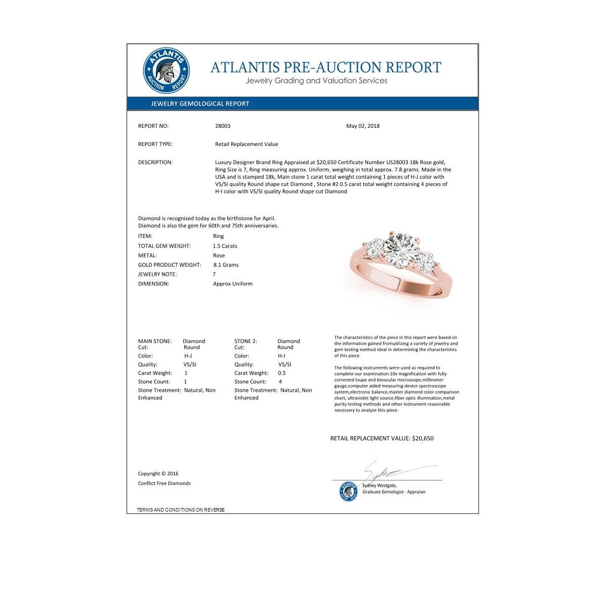 REF-417N5Y -28003 ---- 1.5 CTW Certified VS/SI Diamond 3 Stone Solitaire Ring 18K Rose Gold ---- Luxury Designer Brand Ring Appraised at $20,650 Certificate Number US28003 18k Rose gold, Ring Size is 7, Ring measuring approx. Uniform, weighing in total approx. 7.8 grams. Made in the USA and is stamped 18k, Main stone 1 carat total weight containing 1 pieces of H-J color with VS/SI quality Round shape cut Diamond , Stone #2 0.5 carat total weight containing 4 pieces of H-I color with VS/SI quality Round shape cut Diamond