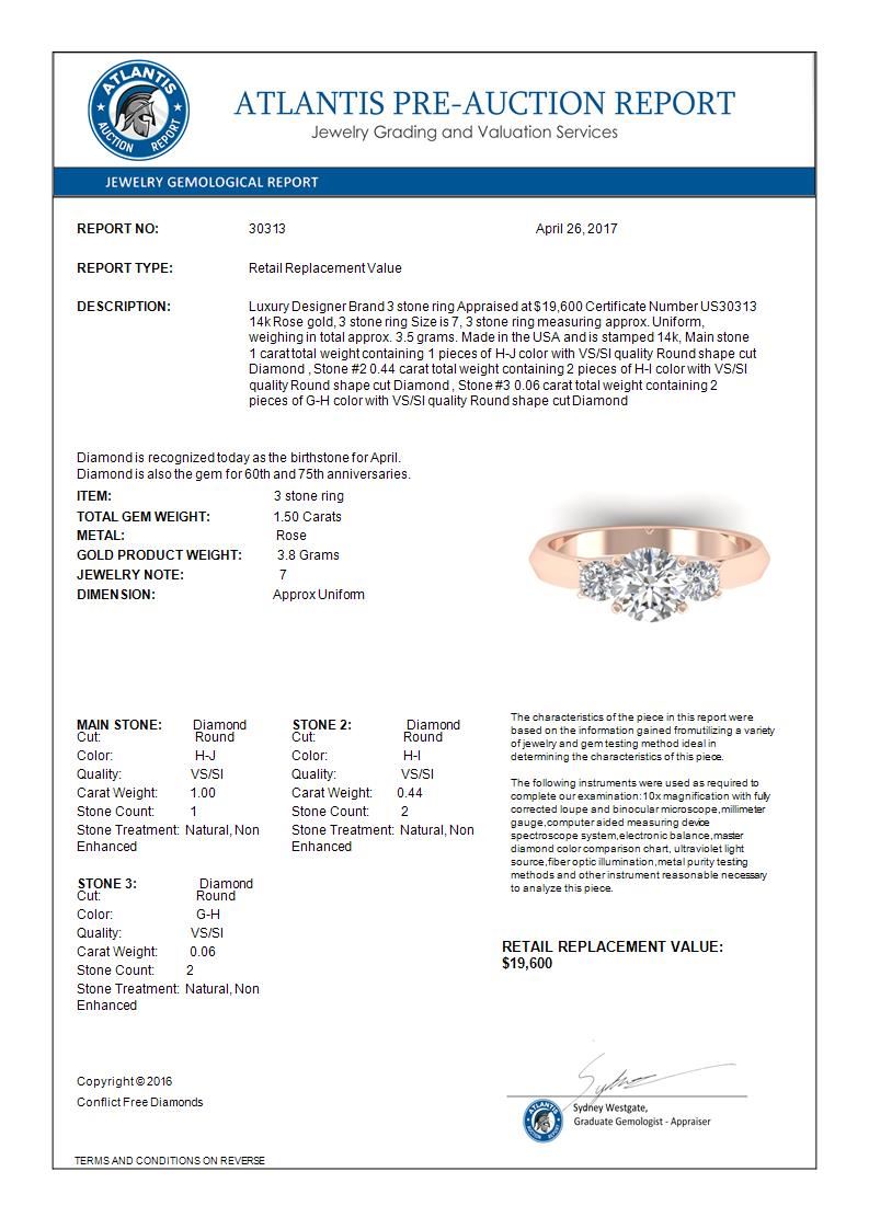 1.5 CTW Certified VS/SI Diamond Solitaire 3 Stone Ring 14K Rose Gold ---- Luxury Designer Brand 3 stone ring Appraised Retail Price at $19,600 ---- SKU Number US30313 14k Rose gold 3 stone ring Size is 7, 3 stone ring measuring approx. Uniform, weighing in total approx. 3.5 grams. Made in the USA and is stamped 14k, Main stone 1.00 carat total weight containing 1 pieces of H-J color with VS/SI quality Round shape cut Diamond , Stone #2 0.44 carat total weight containing 2 pieces of H-I color with VS/SI quality Round shape cut