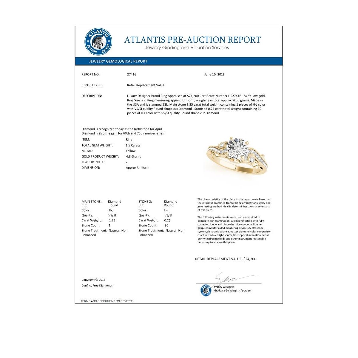 REF-488Y5K -27416 ---- 1.5 CTW Certified VS/SI Diamond Solitaire Antique Ring 18K Yellow Gold ---- Luxury Designer Brand Ring Appraised at $24,200 Certificate Number US27416 18k Yellow gold, Ring Size is 7, Ring measuring approx. Uniform, weighing in total approx. 4.55 grams. Made in the USA and is stamped 18k, Main stone 1.25 carat total weight containing 1 pieces of H-J color with VS/SI quality Round shape cut Diamond , Stone #2 0.25 carat total weight containing 30 pieces of H-I color with VS/SI quality Round shape cut Diamond