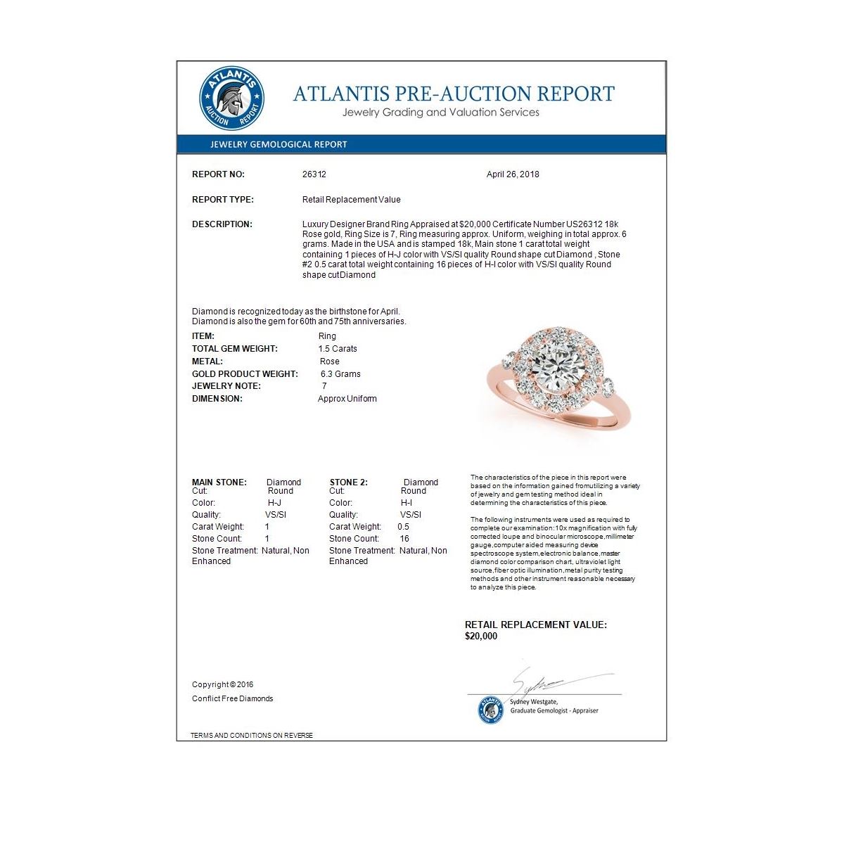 REF-404W4F -26312 ---- 1.5 CTW Certified VS/SI Diamond Solitaire Halo Ring 18K Rose Gold ---- Luxury Designer Brand Ring Appraised at $20,000 Certificate Number US26312 18k Rose gold, Ring Size is 7, Ring measuring approx. Uniform, weighing in total approx. 6 grams. Made in the USA and is stamped 18k, Main stone 1 carat total weight containing 1 pieces of H-J color with VS/SI quality Round shape cut Diamond , Stone #2 0.5 carat total weight containing 16 pieces of H-I color with VS/SI quality Round shape cut Diamond