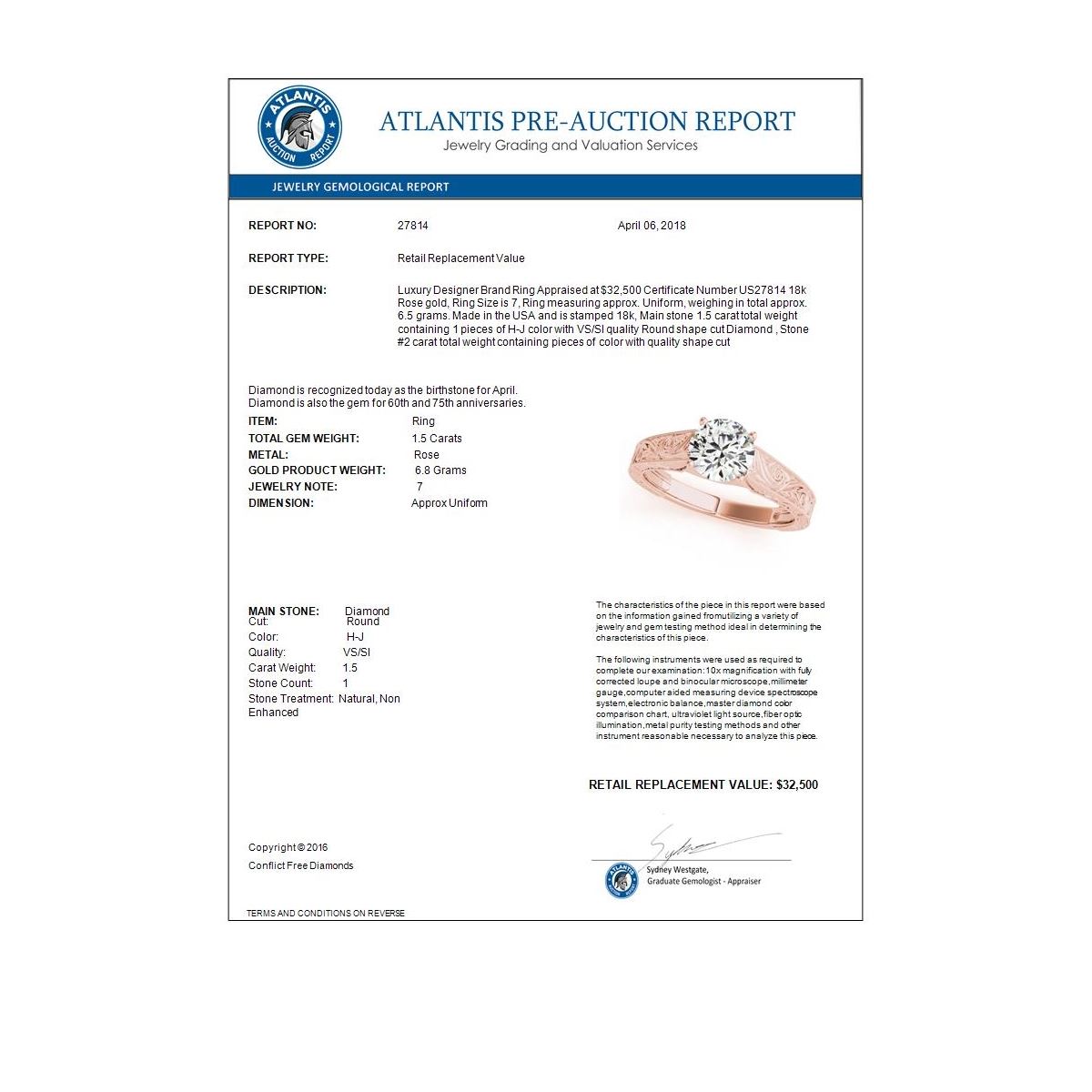 REF-574W2F -27814 ---- 1.5 CTW Certified VS/SI Diamond Solitaire Ring 18K Rose Gold ---- Luxury Designer Brand Ring Appraised at $32,500 Certificate Number US27814 18k Rose gold, Ring Size is 7, Ring measuring approx. Uniform, weighing in total approx. 6.5 grams. Made in the USA and is stamped 18k, Main stone 1.5 carat total weight containing 1 pieces of H-J color with VS/SI quality Round shape cut Diamond , Stone #2 carat total weight containing pieces of color with quality shape cut