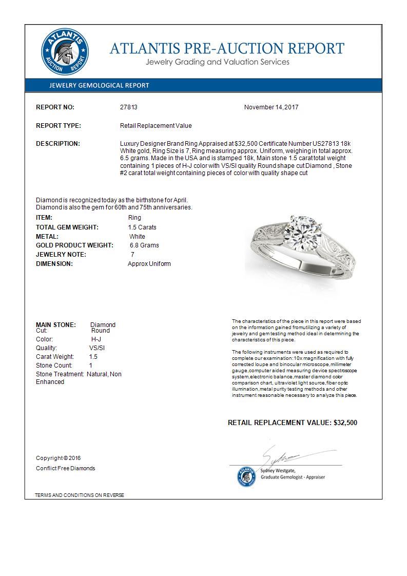 REF-574H2A -27813 ---- 1.5 CTW Certified VS/SI Diamond Solitaire Ring 18K White Gold ---- Luxury Designer Brand Ring Appraised at $32,500 Certificate Number US27813 18k White gold, Ring Size is 7, Ring measuring approx. Uniform, weighing in total approx. 6.5 grams. Made in the USA and is stamped 18k, Main stone 1.5 carat total weight containing 1 pieces of H-J color with VS/SI quality Round shape cut Diamond , Stone #2 carat total weight containing pieces of color with quality shape cut