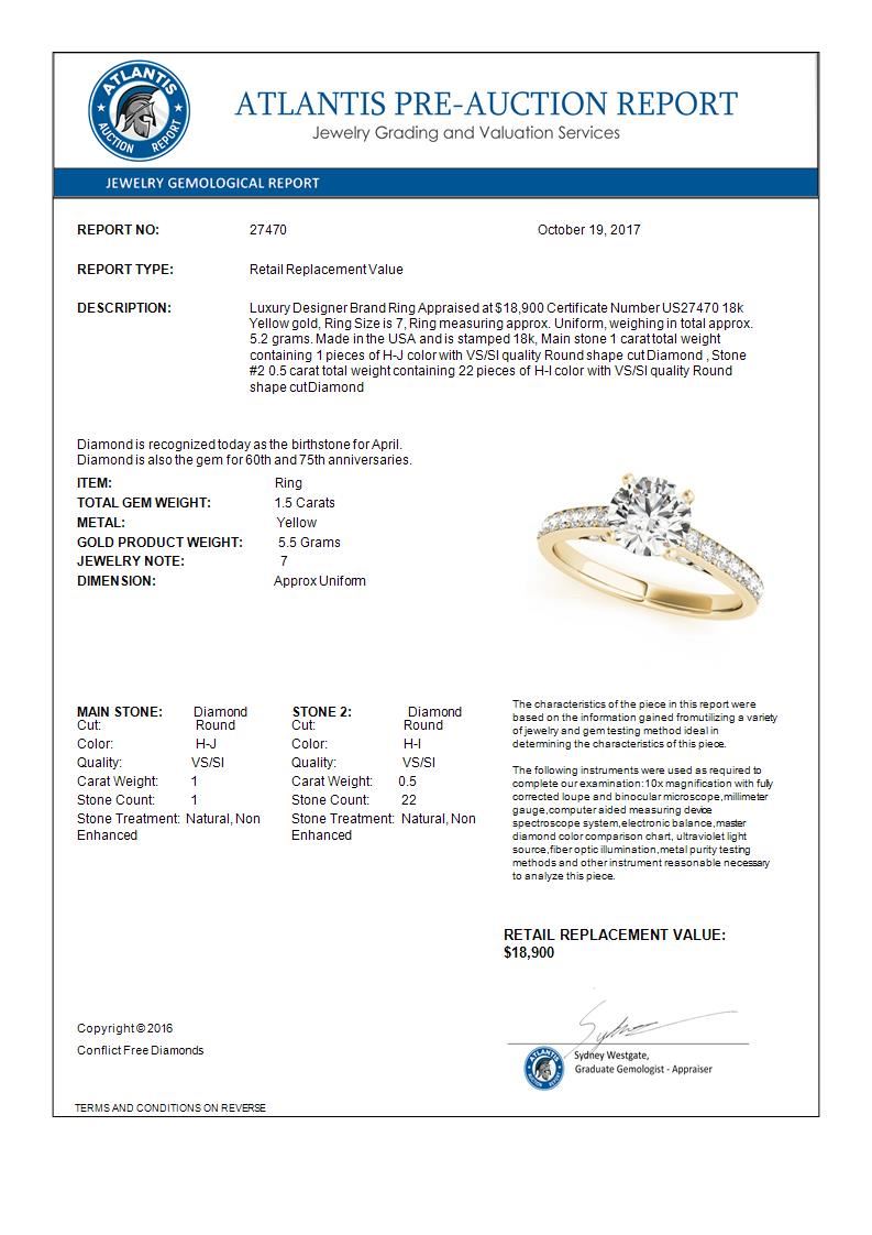 REF-381W8F -27470 ---- 1.5 CTW Certified VS/SI Diamond Solitaire Ring 18K Yellow Gold ---- Luxury Designer Brand Ring Appraised at $18,900 Certificate Number US27470 18k Yellow gold, Ring Size is 7, Ring measuring approx. Uniform, weighing in total approx. 5.2 grams. Made in the USA and is stamped 18k, Main stone 1 carat total weight containing 1 pieces of H-J color with VS/SI quality Round shape cut Diamond , Stone #2 0.5 carat total weight containing 22 pieces of H-I color with VS/SI quality Round shape cut Diamond