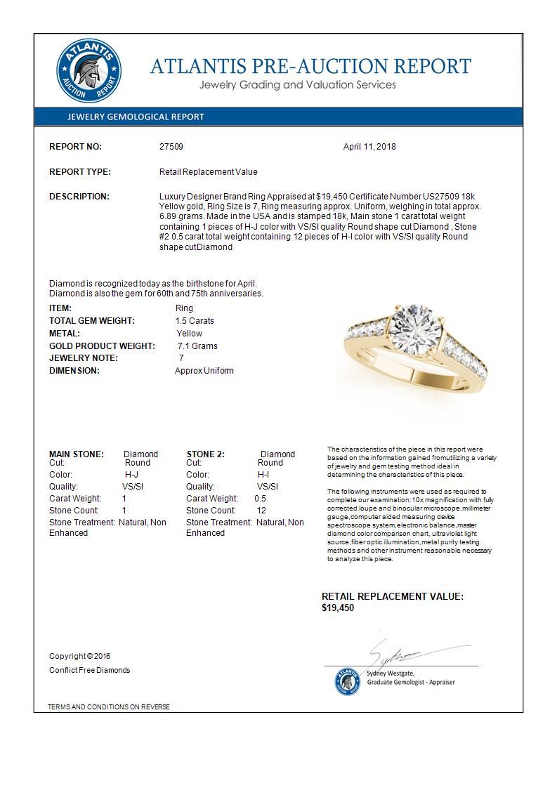 REF-393M3H -27509 ---- 1.5 CTW Certified VS/SI Diamond Solitaire Ring 18K Yellow Gold ---- Luxury Designer Brand Ring Appraised at $19,450 Certificate Number US27509 18k Yellow gold, Ring Size is 7, Ring measuring approx. Uniform, weighing in total approx. 6.89 grams. Made in the USA and is stamped 18k, Main stone 1 carat total weight containing 1 pieces of H-J color with VS/SI quality Round shape cut Diamond , Stone #2 0.5 carat total weight containing 12 pieces of H-I color with VS/SI quality Round shape cut Diamond