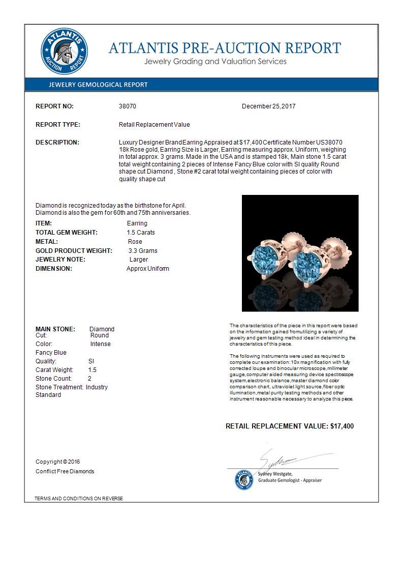 REF-263M6H -38070 ---- 1.5 CTW Fancy Intense Blue Diamond Art Deco Stud Earrings 18K Rose Gold ---- Luxury Designer Brand Earring Appraised at $17,400 Certificate Number US38070 18k Rose gold, Earring Size is Larger, Earring measuring approx. Uniform, weighing in total approx. 3 grams. Made in the USA and is stamped 18k, Main stone 1.5 carat total weight containing 2 pieces of Intense Fancy Blue color with SI quality Round shape cut Diamond , Stone #2 carat total weight containing pieces of color with quality shape cut