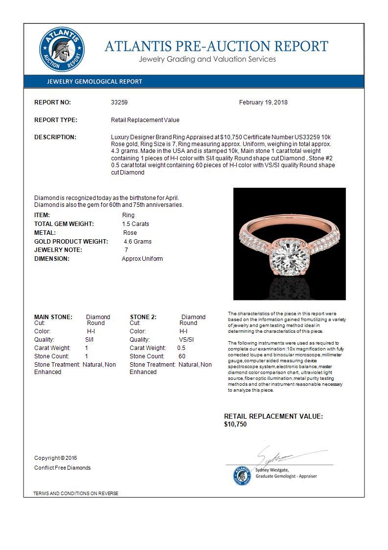 REF-177N6Y -33259 ---- 1.5 CTW H-SI/I Certified Diamond Solitaire Halo Ring 10K Rose Gold ---- Luxury Designer Brand Ring Appraised at $10,750 Certificate Number US33259 10k Rose gold, Ring Size is 7, Ring measuring approx. Uniform, weighing in total approx. 4.3 grams. Made in the USA and is stamped 10k, Main stone 1 carat total weight containing 1 pieces of H-I color with SI/I quality Round shape cut Diamond , Stone #2 0.5 carat total weight containing 60 pieces of H-I color with VS/SI quality Round shape cut Diamond