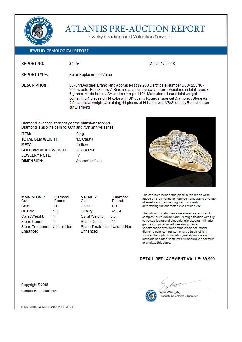 REF-180M2H -34258 ---- 1.5 CTW H-SI/I Certified Diamond Solitaire Halo Ring 10K Yellow Gold ---- Luxury Designer Brand Ring Appraised at $9,900 Certificate Number US34258 10k Yellow gold, Ring Size is 7, Ring measuring approx. Uniform, weighing in total approx. 6 grams. Made in the USA and is stamped 10k, Main stone 1 carat total weight containing 1 pieces of H-I color with SI/I quality Round shape cut Diamond , Stone #2 0.5 carat total weight containing 44 pieces of H-I color with VS/SI quality Round shape cut Diamond