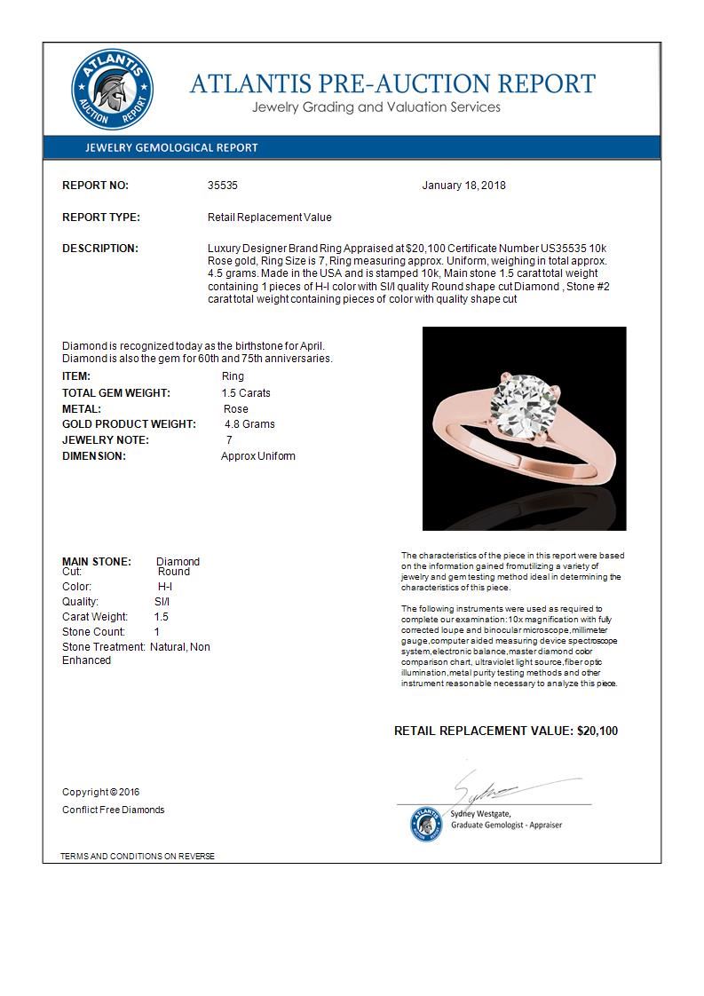 REF-332F4N -35535 ---- 1.5 CTW H-SI/I Certified Diamond Solitaire Ring 10K Rose Gold ---- Luxury Designer Brand Ring Appraised at $20,100 Certificate Number US35535 10k Rose gold, Ring Size is 7, Ring measuring approx. Uniform, weighing in total approx. 4.5 grams. Made in the USA and is stamped 10k, Main stone 1.5 carat total weight containing 1 pieces of H-I color with SI/I quality Round shape cut Diamond , Stone #2 carat total weight containing pieces of color with quality shape cut