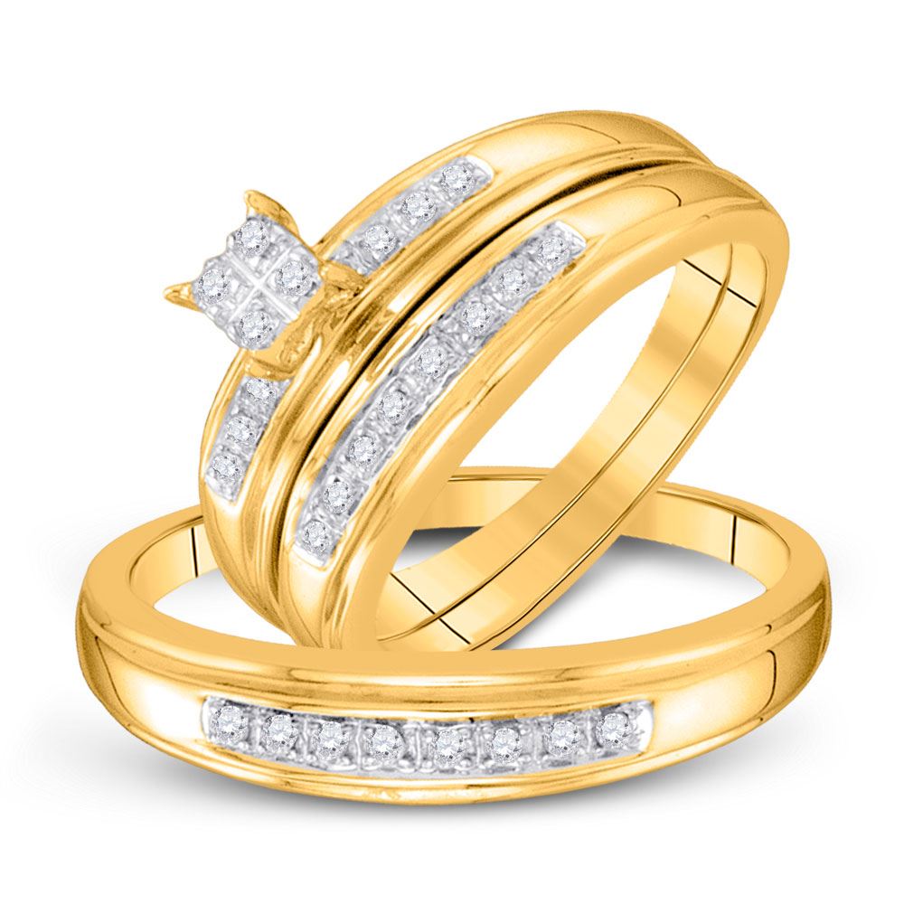 10kt Yellow Gold His & Hers Round Diamond Square Cluster Matching Bridal Wedding Ring Band Set 1/5 Cttw