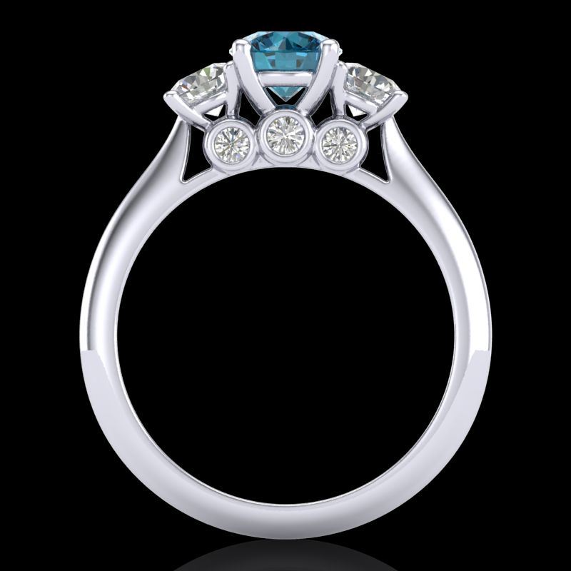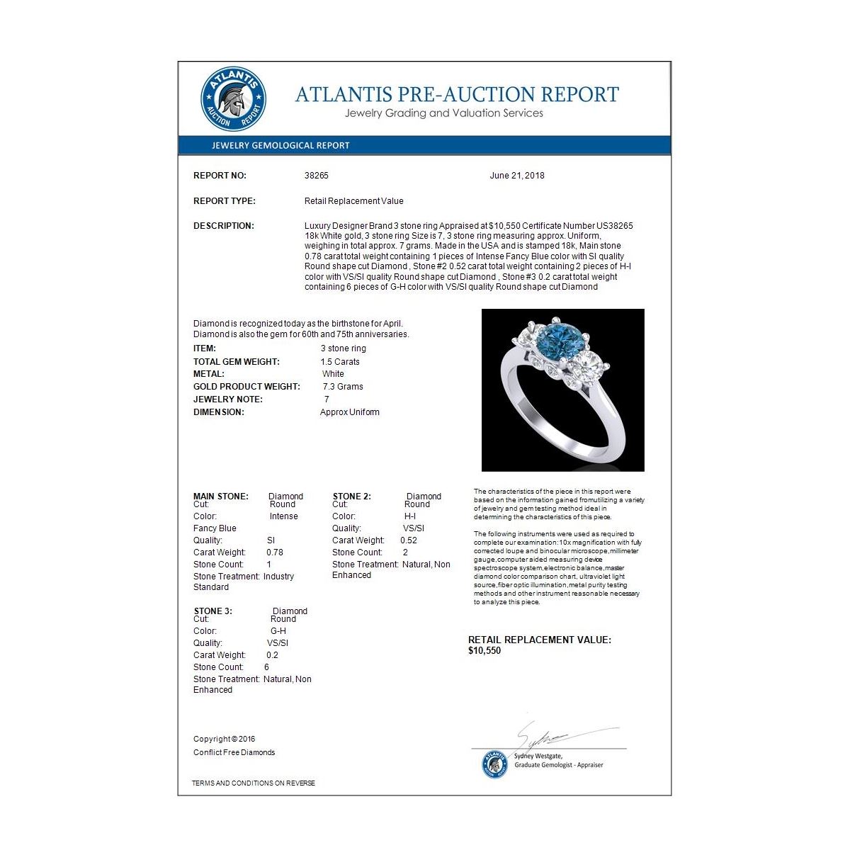 REF-174T5M -38265 ---- 1.5 CTW Intense Blue Diamond Solitaire Art Deco 3 Stone Ring 18K White Gold ---- Luxury Designer Brand 3 stone ring Appraised at $10,550 Certificate Number US38265 18k White gold, 3 stone ring Size is 7, 3 stone ring measuring approx. Uniform, weighing in total approx. 7 grams. Made in the USA and is stamped 18k, Main stone 0.78 carat total weight containing 1 pieces of Intense Fancy Blue color with SI quality Round shape cut Diamond , Stone #2 0.52 carat total weight containing 2 pieces of H-I color with VS/SI quality Round shape cut Diamond , Stone #3 0.2 carat total weight containing 6 pieces of G-H color with VS/SI quality Round shape cut Diamond