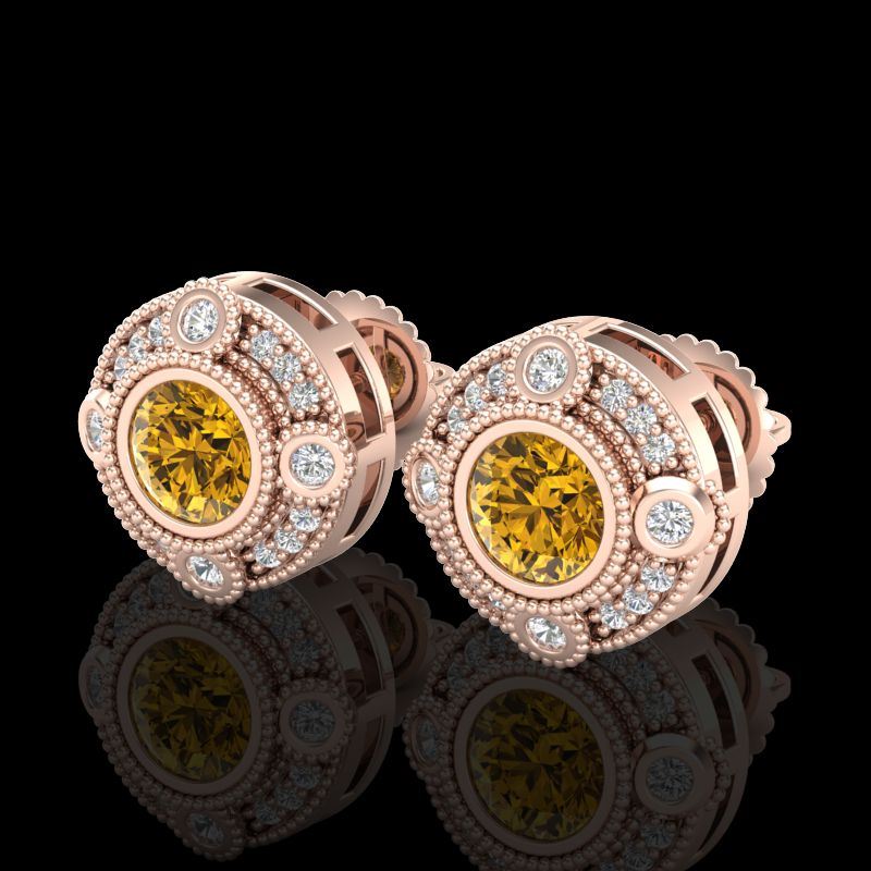 REF-178K2W -37701 ---- 1.5 CTW Intense Fancy Yellow Diamond Art Deco Stud Earrings 18K Rose Gold ---- Luxury Designer Brand Earring Appraised at $11,750 Certificate Number US37701 18k Rose gold, Earring Size is Larger, Earring measuring approx. Uniform, weighing in total approx. 8.5 grams. Made in the USA and is stamped 18k, Main stone 1.15 carat total weight containing 2 pieces of Intense Fancy Yellow color with SI quality Round shape cut Diamond , Stone #2 0.35 carat total weight containing 32 pieces of H-I color with VS/SI quality Round shape cut Diamond