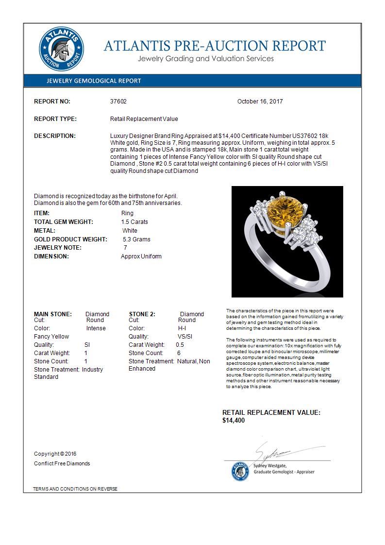 REF-218W2F -37602 ---- 1.5 CTW Intense Fancy Yellow Diamond Solitaire Classic Ring 18K White Gold ---- Luxury Designer Brand Ring Appraised at $14,400 Certificate Number US37602 18k White gold, Ring Size is 7, Ring measuring approx. Uniform, weighing in total approx. 5 grams. Made in the USA and is stamped 18k, Main stone 1 carat total weight containing 1 pieces of Intense Fancy Yellow color with SI quality Round shape cut Diamond , Stone #2 0.5 carat total weight containing 6 pieces of H-I color with VS/SI quality Round shape cut Diamond