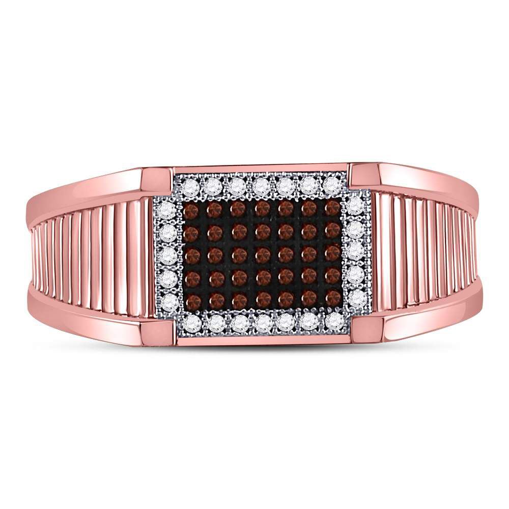 10kt Rose Gold Mens Round Red Color Enhanced Diamond Rectangle Cluster Ring 1/5 Cttw