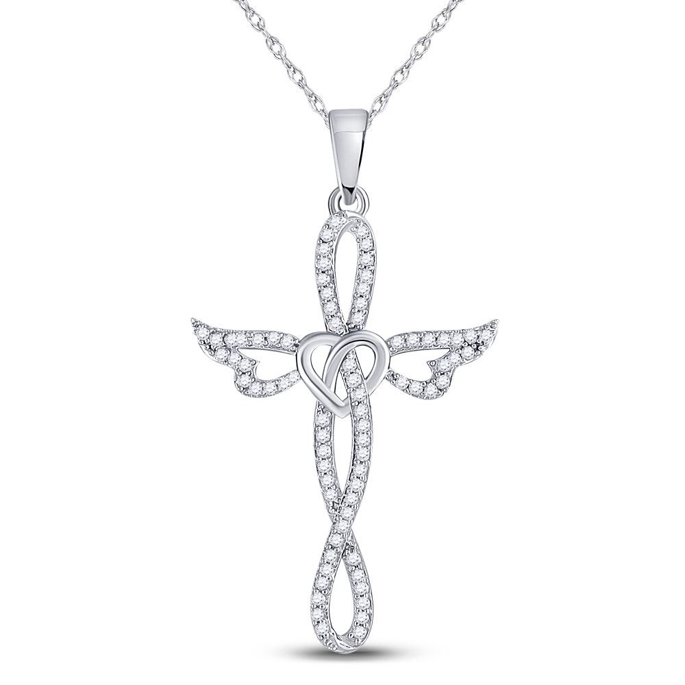 10kt White Gold Womens Round Diamond Cross Heart Winged Pendant 1/5 Cttw